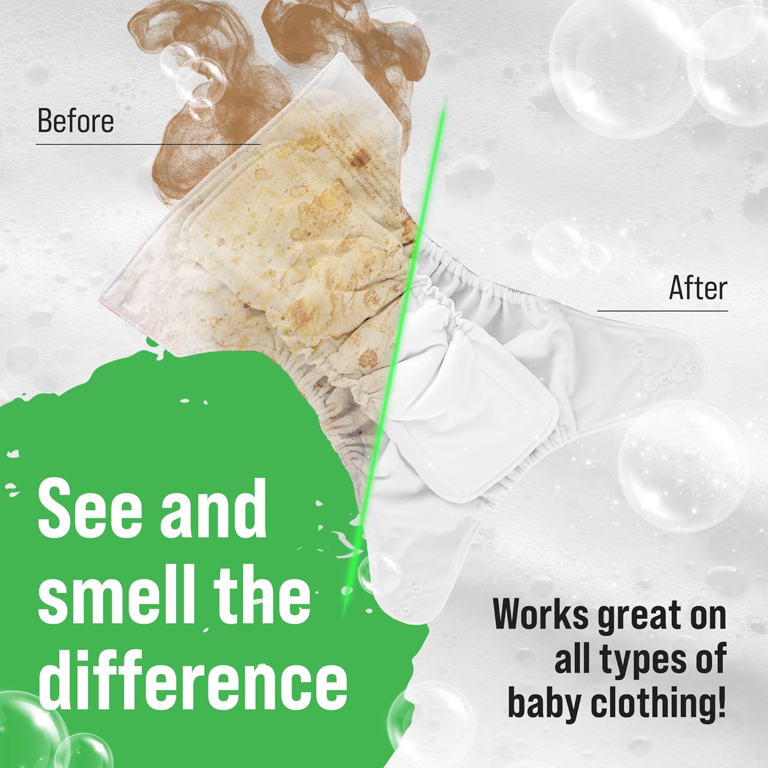 - Designed For Cloth Baby Diapers - Rockin' Green Baby Detergent Powder is perfect for parents who use cloth diapers for their babies. You can use it with all types of washing machines and even as a soak to eliminate funky odors!