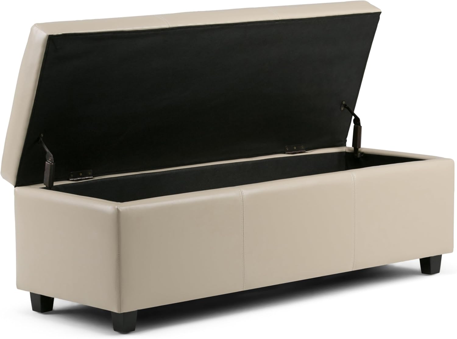 SIMPLIHOME Avalon 48 inch Wide Contemporary Rectangle Storage Ottoman Bench in Satin Cream Vegan Faux Leather, Assembled, for the Living Room, Entryway and Family Room