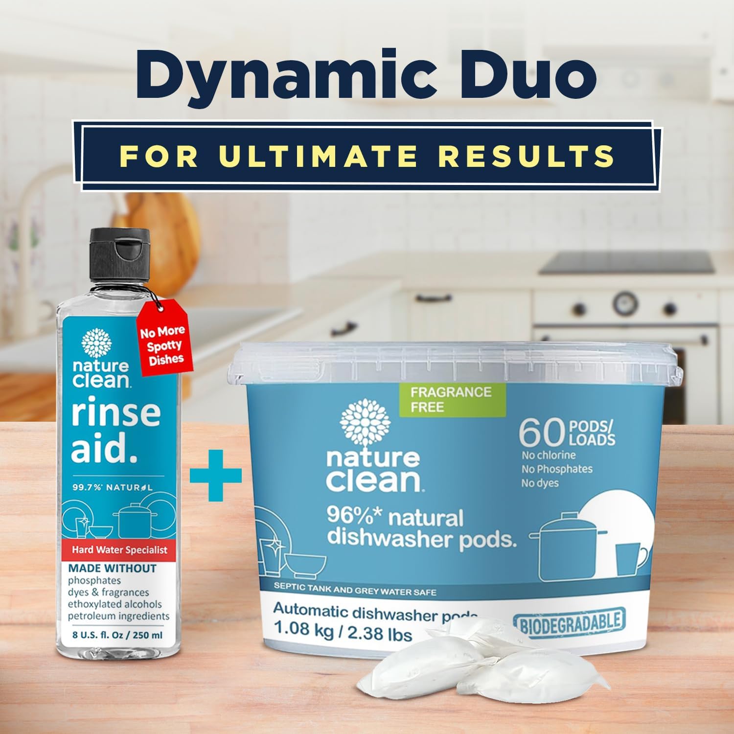 - Natural Dishwasher Pods: Nature Clean dishwasher pods are made with a plant-based formula free from chlorine, phosphates, and dyes; Enjoy spotless dishes with dish detergent pods that keep harmful chemicals out of your home while delivering a safe, powerful clean