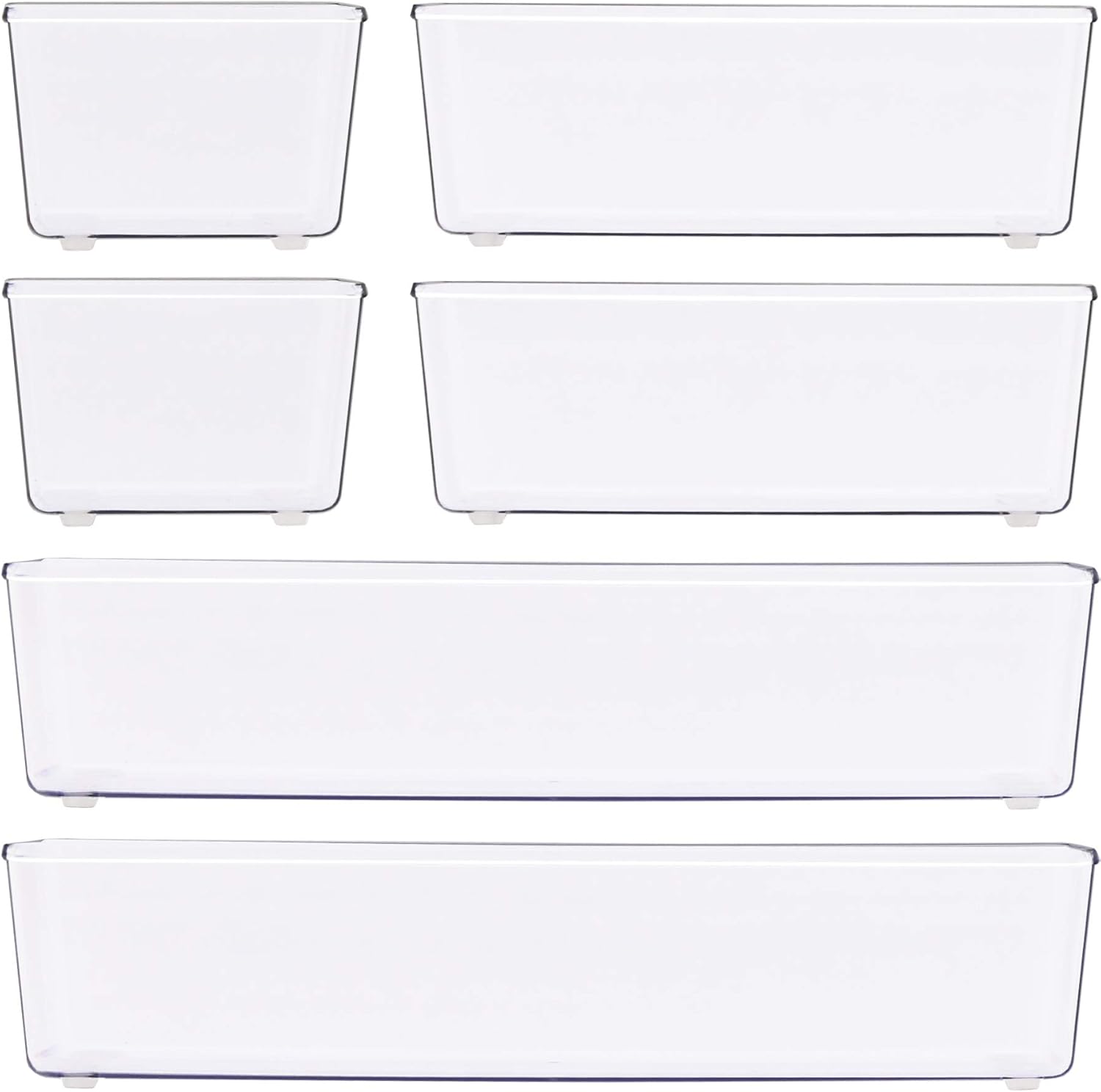 - 【 6-Pack Assorted Drawer Organizers 】Includes 6 clear bins in 3 different sizes—ideal for organizing makeup, office supplies, bathroom items, and crafts.