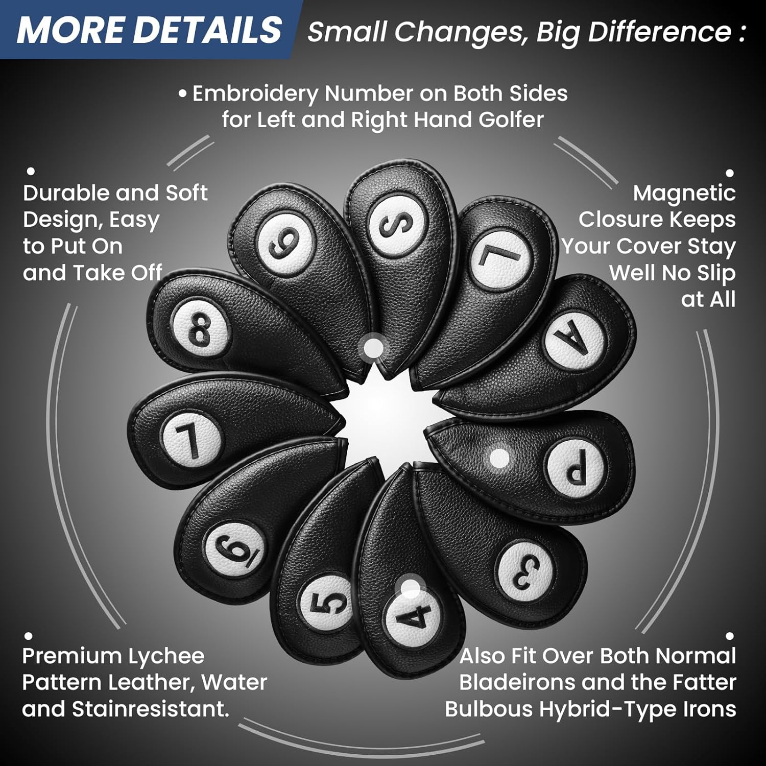 FINGER TEN Golf Club Covers for Irons Magnetic Value 11 Pack, Synthetic Leather Deluxe Head Cover Set Headcovers for Irons Fit Main Iron Clubs