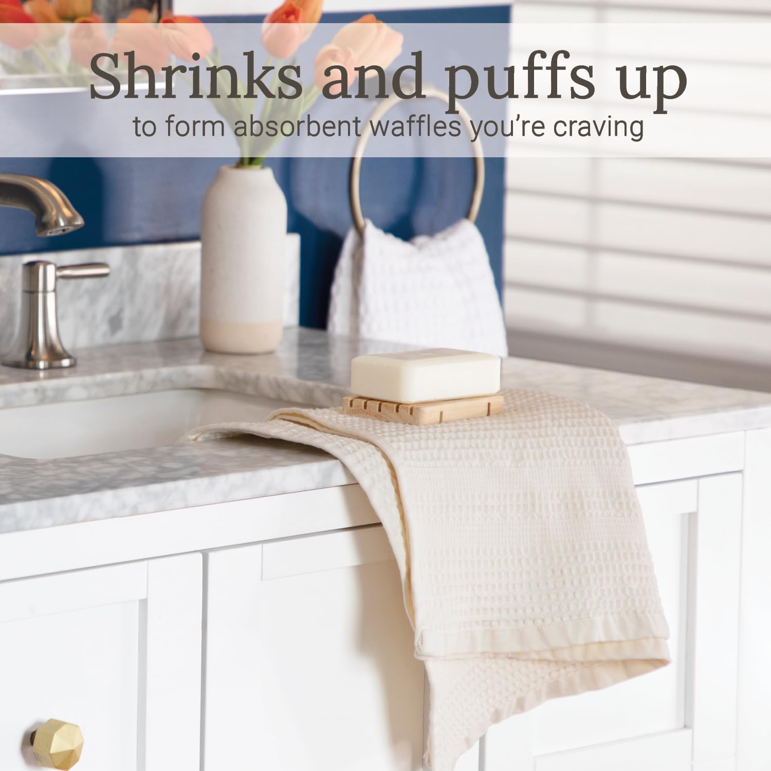 - Super Absorbent Hand Towels: Made from thirsty high quality cotton, they shrink to form small honeycomb waffles that quickly wicks away moisture while providing a cozy, comfortable feel for drying hands.