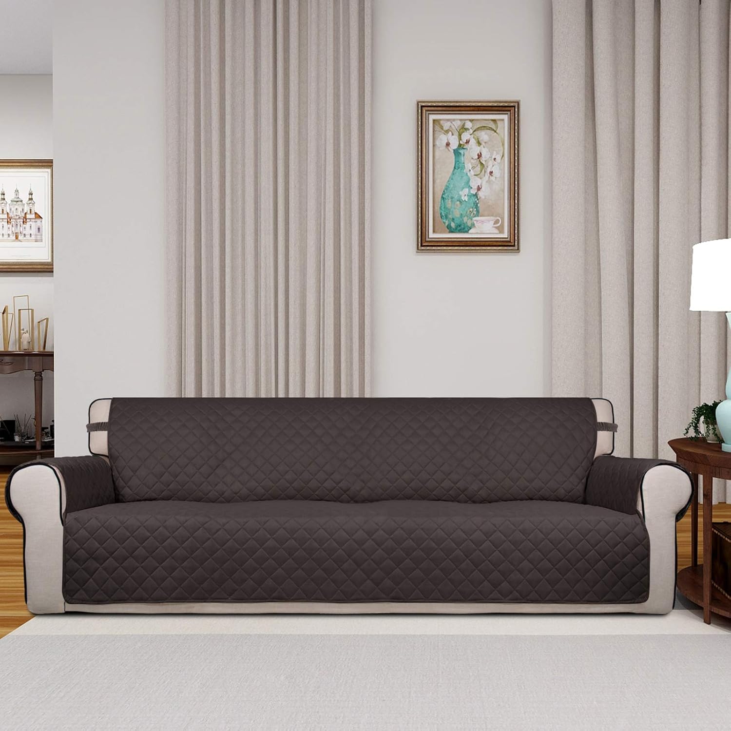 PureFit Reversible Quilted Sofa Cover, Water Resistant Slipcover Furniture Protector, Washable Couch Cover with Non Slip and Elastic Straps for Kids, Dogs, Pets (XX Large, Chocolate/Chocolate)