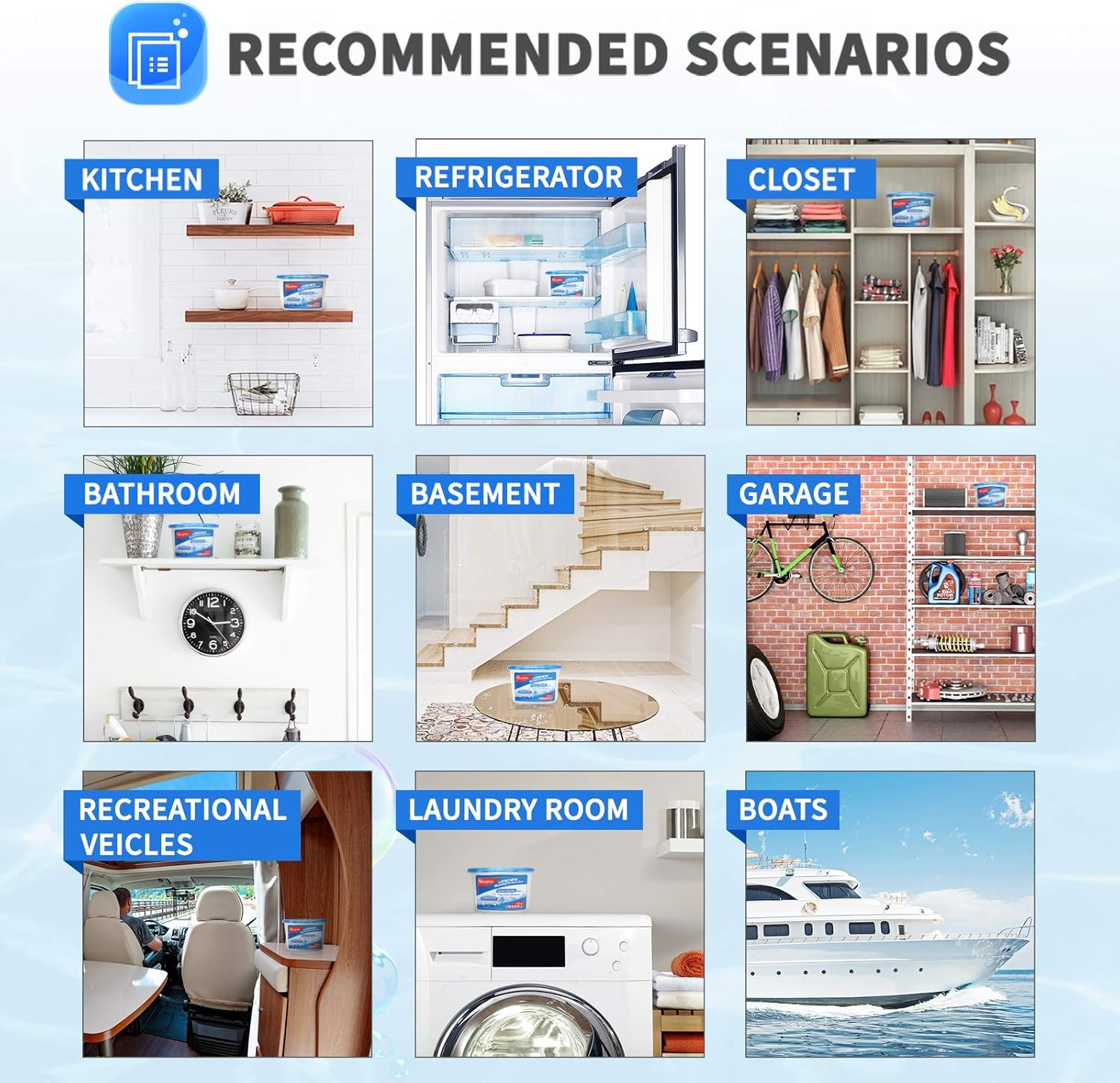 - Free Your Nose : Vacplus moisture removers with ocean fragrance could eliminate musty smell while releasing the pleasing fragrance at the same time. This safe moisture absorber is definitely a portable odor absorber for homes, closets, bathrooms, kitchens, laundry rooms, touring cars, shoe cabinets, boats, and closed spaces.