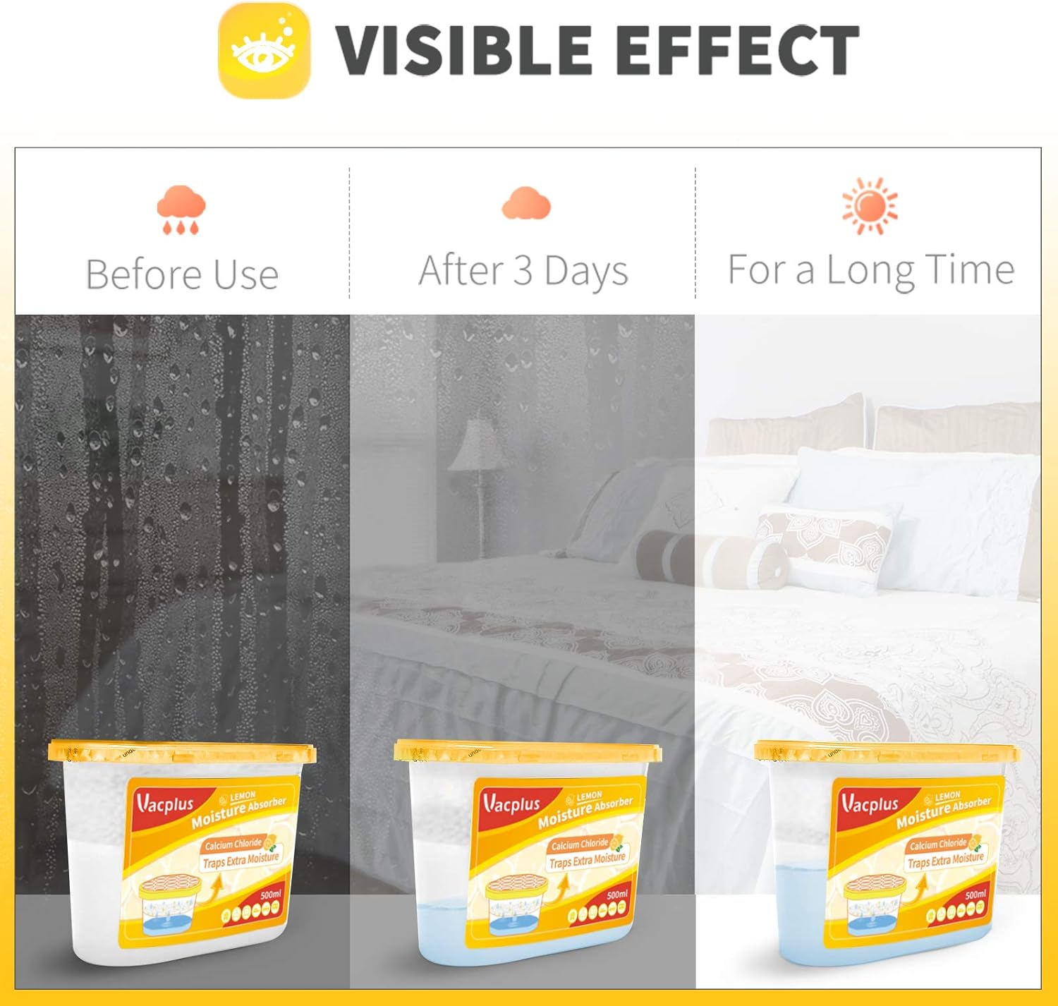 - Efficient Dehumidification: Traps excess moisture quickly. Vacplus moisture absorbers use spherical calcium chloride to enlarge the absorbing area. The large collecting capacity of this moisture remover keeps a long time dry.