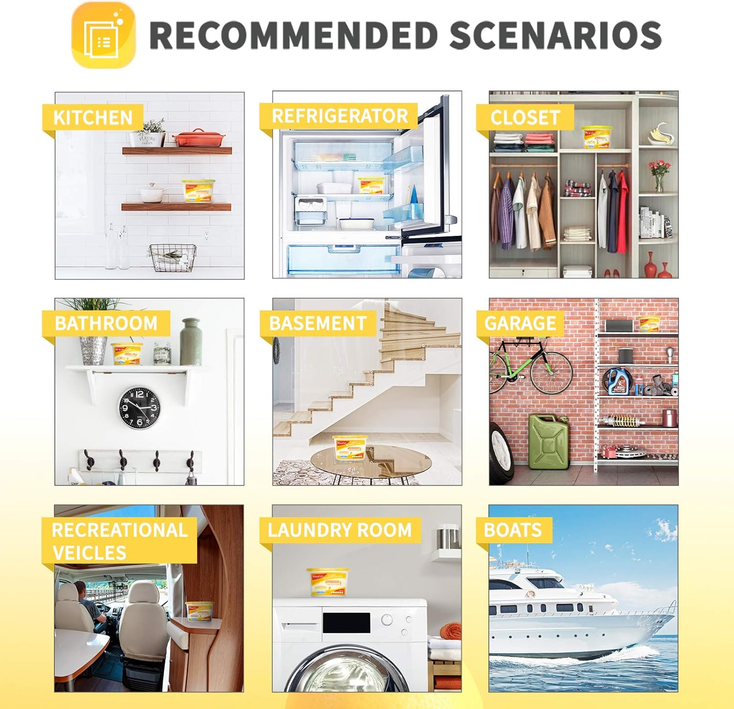 - Free Your Nose : Vacplus moisture removers with lemon fragrance could eliminate musty smell while releasing the pleasing fragrance at the same time. This safe moisture absorber is definitely a portable odor absorber for homes, closets, bathrooms, kitchens, laundry rooms, touring cars, shoe cabinets, boats, and closed spaces.