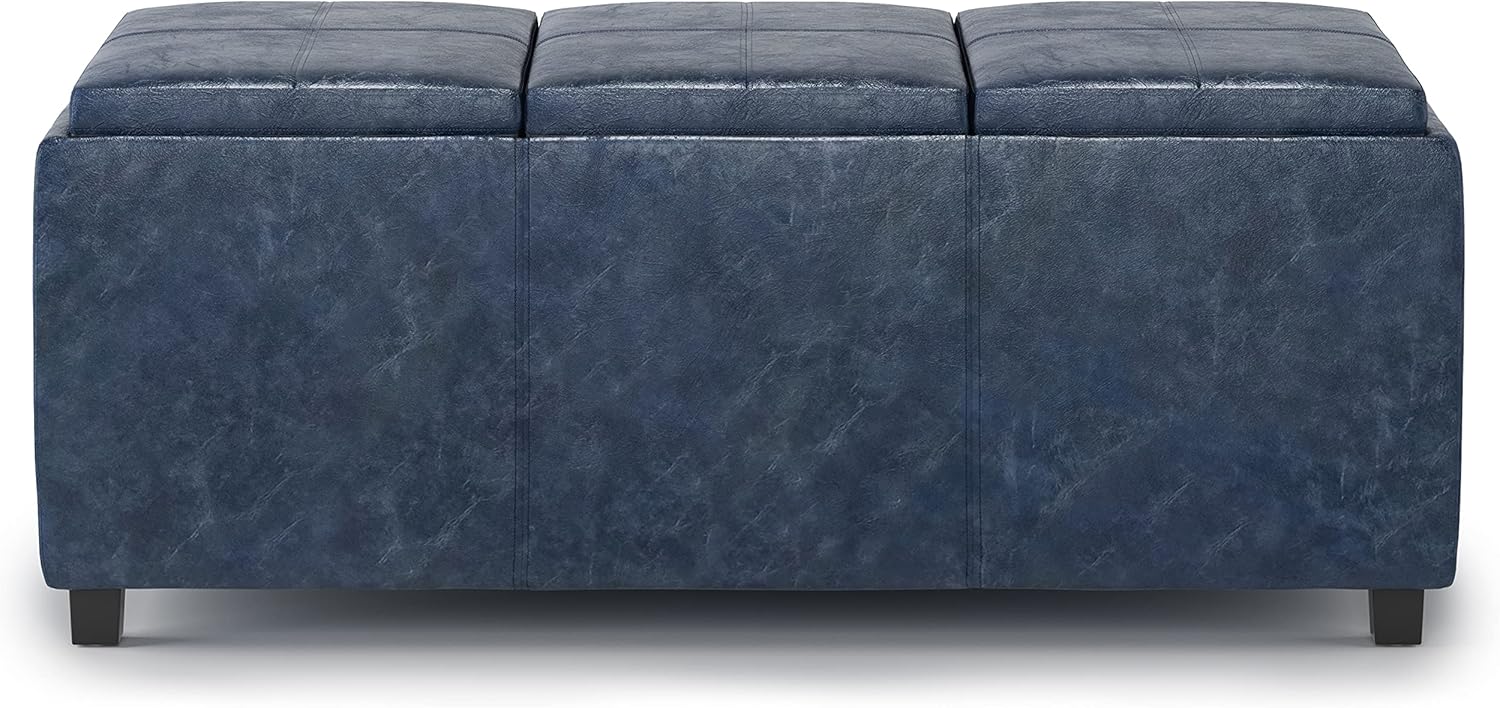 SIMPLIHOME Avalon 42 inch Wide Contemporary Rectangle Storage Ottoman in Denim Blue Vegan Faux Leather, Assembled, for the Living Room, Entryway and Family Room