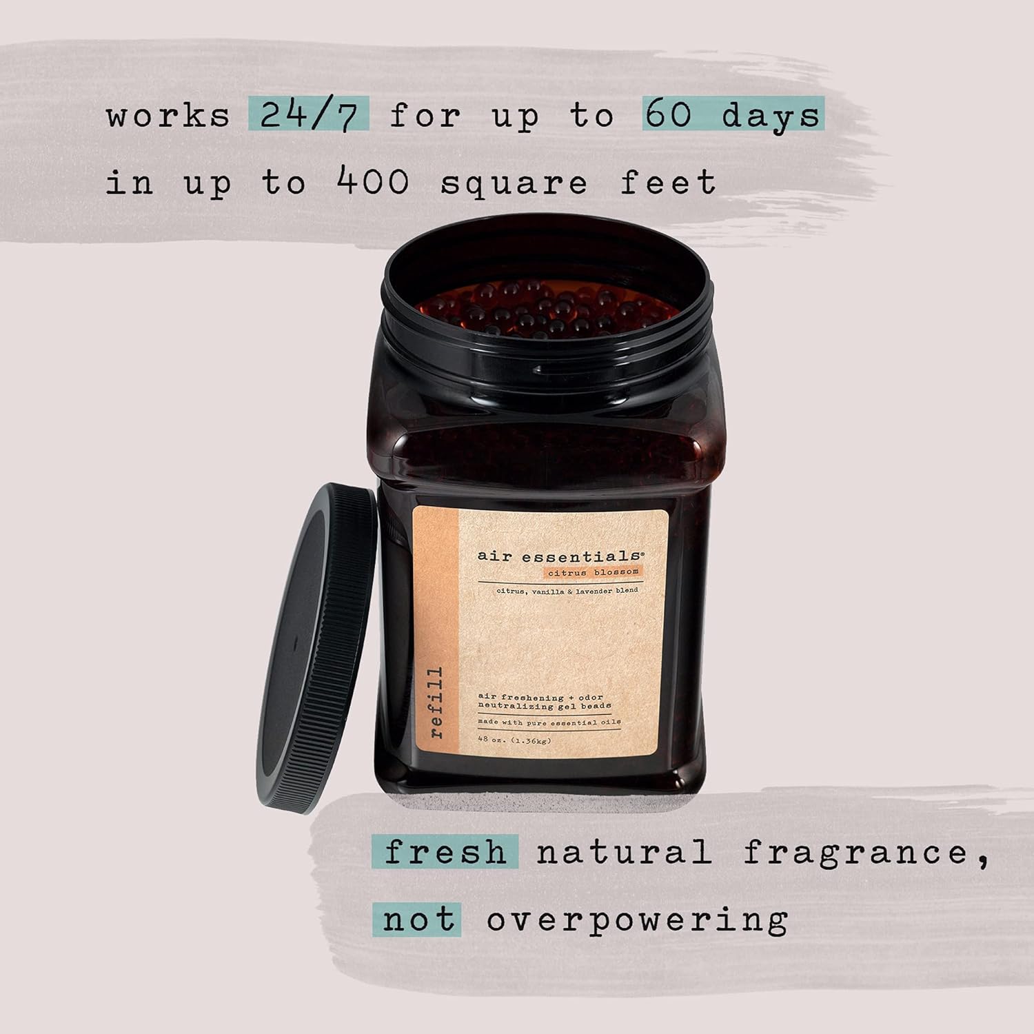 - MADE WITH PURE ESSENTIAL OILS - Air Essentials Air Freshening & Odor Neutralizing Gel Bead Refill contains only plant derived ingredients and a blend of pure essential oils. Each jar provides a pleasant fragrance that does not overwhelm the senses. The Gel Beads will work 24/7 for up to 60 days in up to 400 square feet.