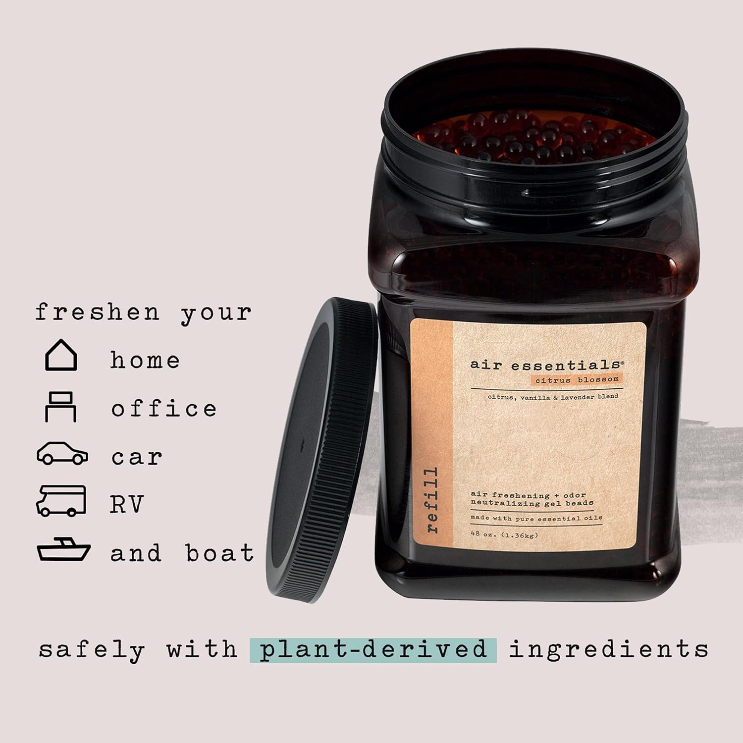 - NEUTRALIZE RECURRING ODORS - Freshen your home, office, car, RV, and boat safely with plant derived ingredients and pure essential oils. The Gel Beads will neutralize odors from smoke, garbage cans, pet areas, food, cooking and anywhere recurring odors are a problem. Pour the Gel Beads into an existing Air Essentials 12 ounce jar or your favorite vase or bowl for added decoration.