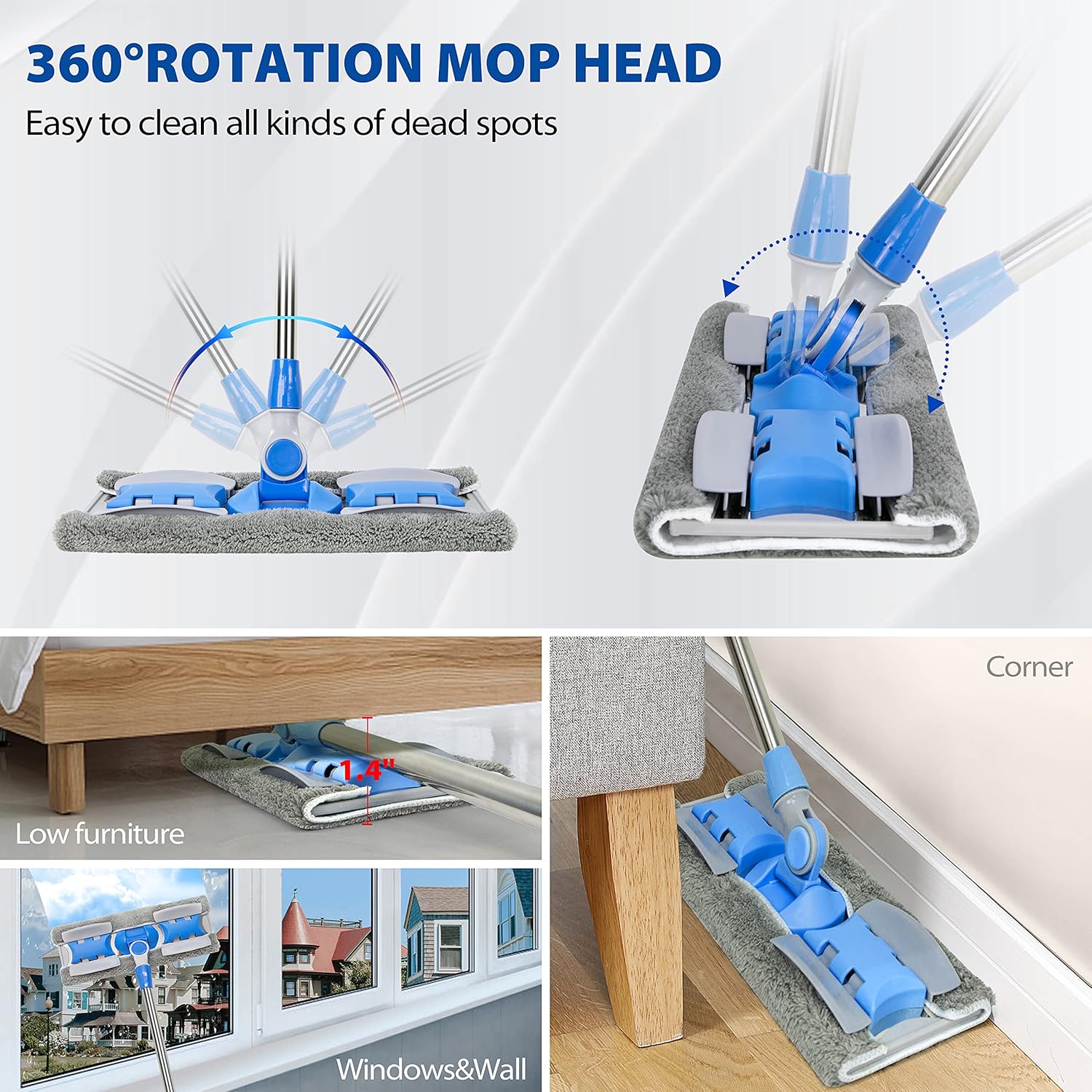 - 👍 【360°Rotating Mop Head&Extended Handle】VAIIGO Microfiber mop head has a 360°rotating design, and the mop head is only 1.4" thick, which is easy to deep clean sofas, beds, crevice and various dead spots stains.And provide 4 stainless steel poles and they can be assembled based on your height, So that you do not have to bend down when cleaning the floor, thus effectively relieve fatigue and back pain. It's also suitable for the elderly and children.(Mop pole adjustable length range 30"-60")