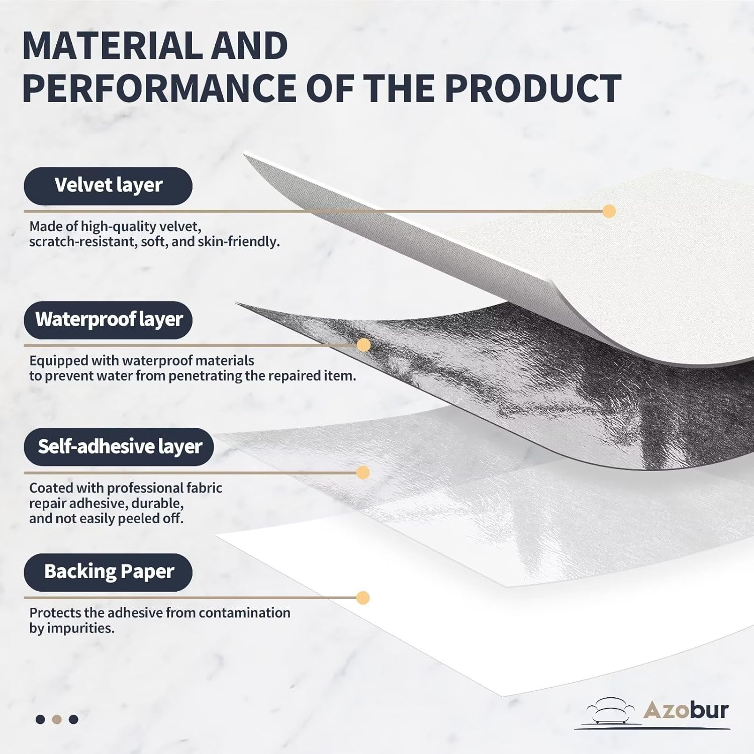 - Material and Performance: The upholstery repair tape features high-quality velvet on the front, which is scratch-resistant, soft, and skin-friendly. It has a waterproof layer in the middle to prevent water from penetrating into the repaired items. The back is coated with professional fabric repair adhesive, typically durable for at least two years. The adhesive comes with a backing paper to protect it from debris. This upholstery tape is odorless and 100% environmentally friendly.