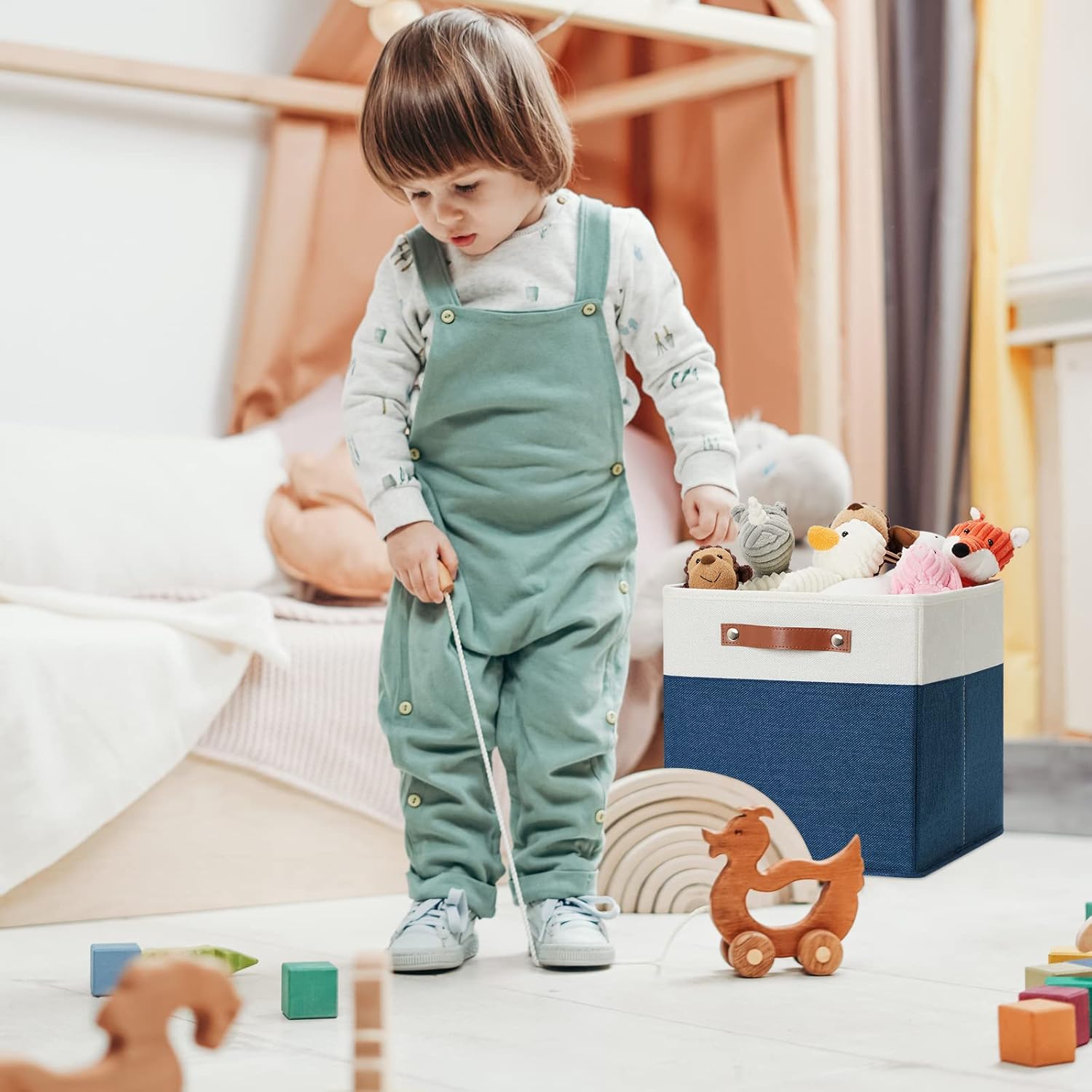 - 【Material】These cube storage bins are constructed of sturdy and attractive linen & cardboard with linen interior lining. The sturdy leather handles make it easy to carry or pull off and out of shelves.