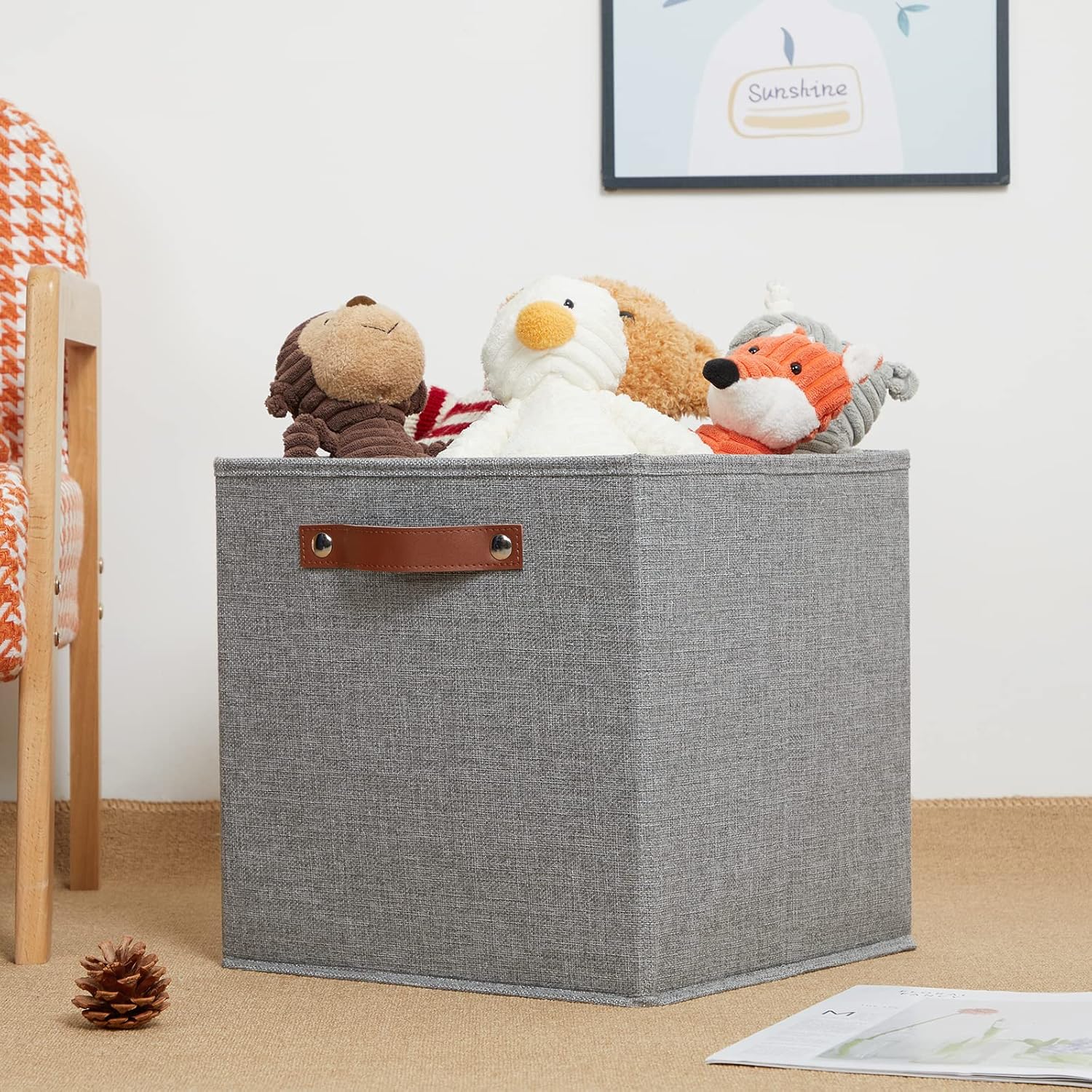 - 【Material】These cube storage bins are constructed of sturdy and attractive linen & cardboard with linen interior lining. The sturdy leather handles make it easy to carry or pull off and out of shelves.