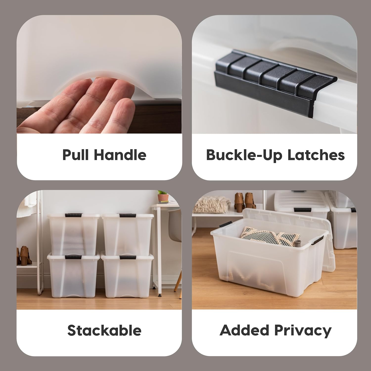 IRIS USA 54 Qt Stackable Plastic Storage Bins with Lids, 4 Pack - BPA-Free, Made in USA - Discreet Organizing Solution, Latches, Durable Nestable Containers, Secure Pull Handle - Pearl