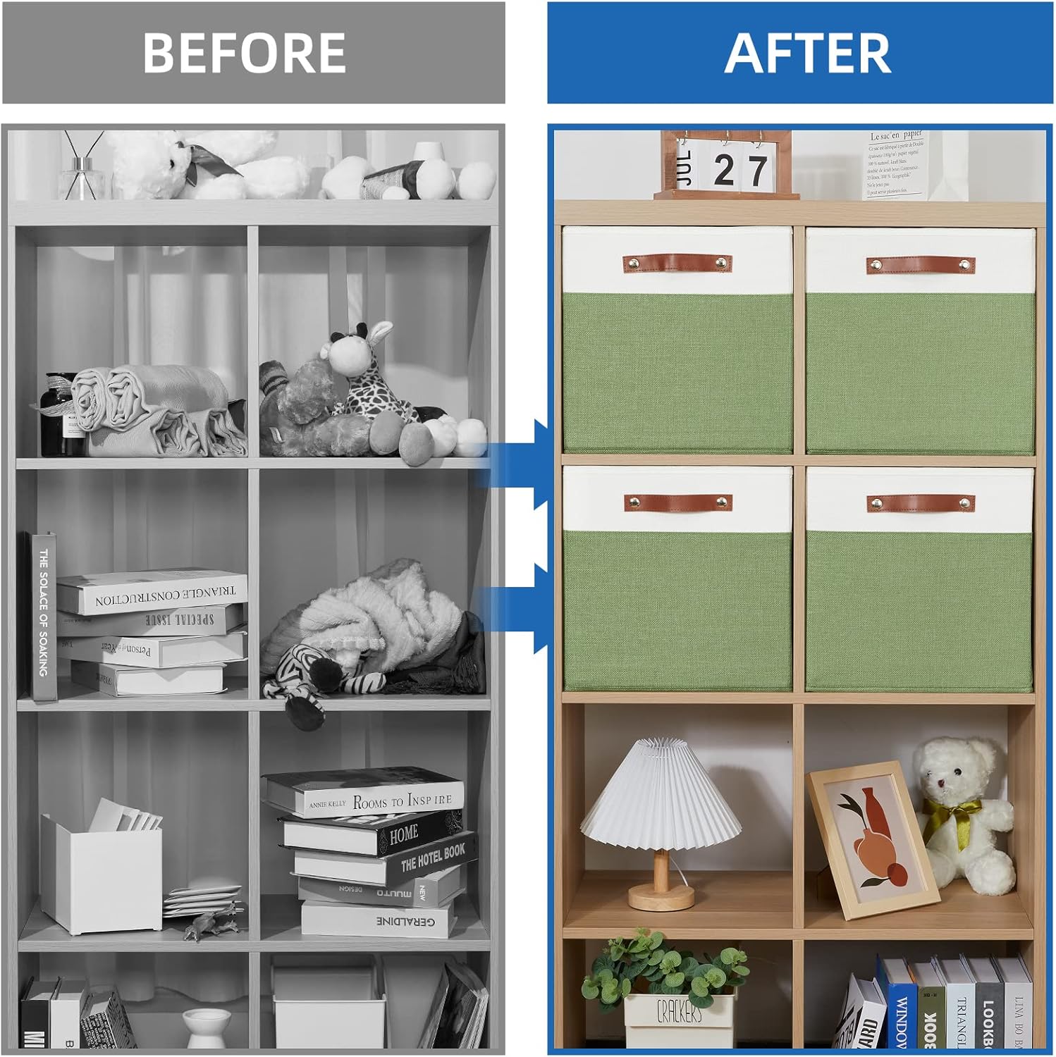 Temary 13 Inch Cube Storage Bin 4 Pack Fabric Storage Cubes Fabric Storage Bin for Shelf, Cube Storage Basket with Leather Handles(White&Green)