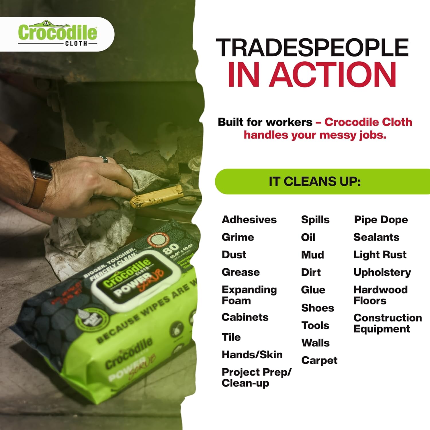 Crocodile Cloth PowerSCRUB Cleaning Wipes – 80 (15" x 10") Dual-Surface Cloths, Heavy-Duty, Moist, Absorbent, & Disposable - Safe on Skin & Multiple Surfaces