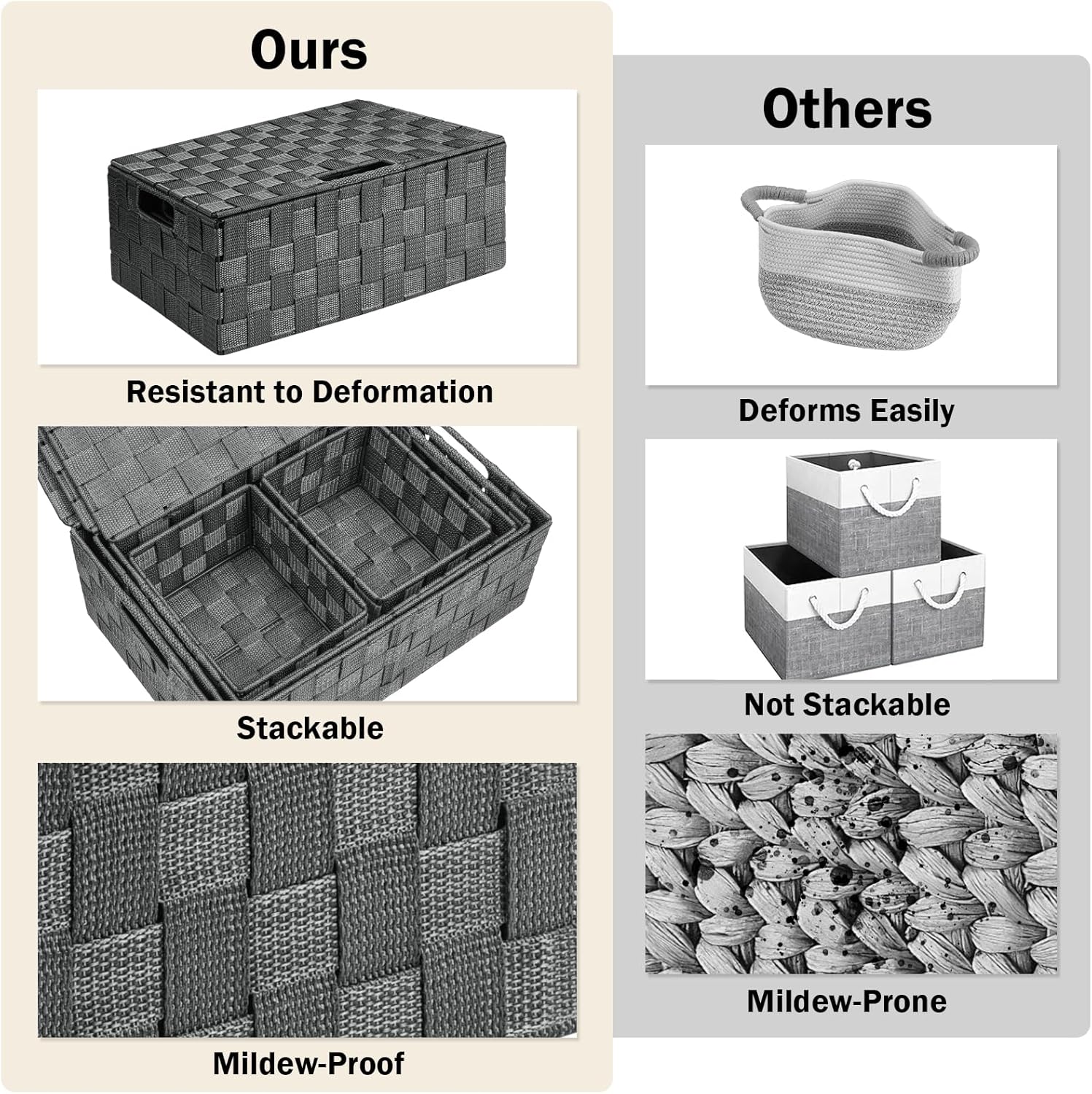 - Versatile for All Space Storage : Storage box can be stacked to store various products. Decorative basket ideal for bathrooms, living room, bedroom, utility room, kids room, craft room, office, closet, kitchen, condos, laundry room, bar cabinet storage, toilet.