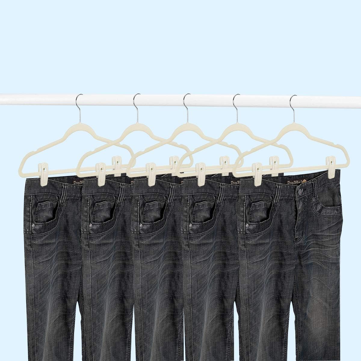 - ✅ High-quality material: These hanger clips are made of PP material and covered with high-grade soft beige velvet. It is very sturdy and durable. The beige velvet hanger clips of 20 packs can be easily matched with velvet hangers of any color and size. It looks very elegant and beautiful.