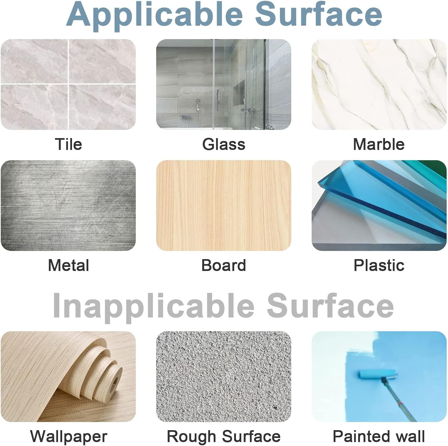 - Caution: The suction cup only works on Glass, Mirrors, Glossy porcelain tiles, Acrylic/Plastic shower snserts, Smooth stainless steel, Quartz, Laminate, and other smooth and non-porous surfaces. DO NOT install the suction over any porous, bumpy, rough, wooden, cracked or textured surface, such as painted walls, doors, wallpaper, unpolised marble, etc