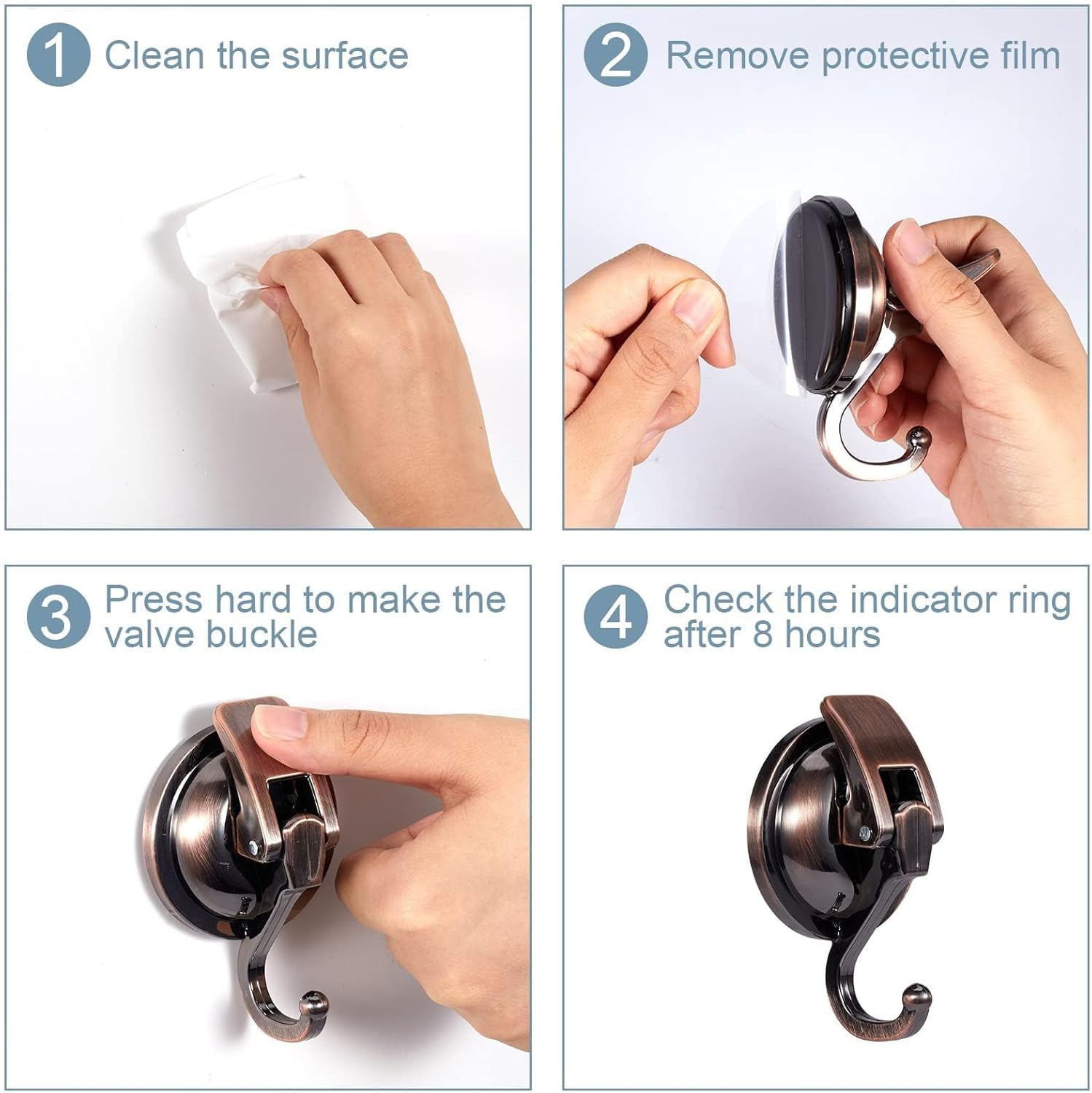 - Use Tips: If the hook can't be sucked up, please wash the surface of the rubber with water, then use a hair dryer to dry and soften the rubber before installation
