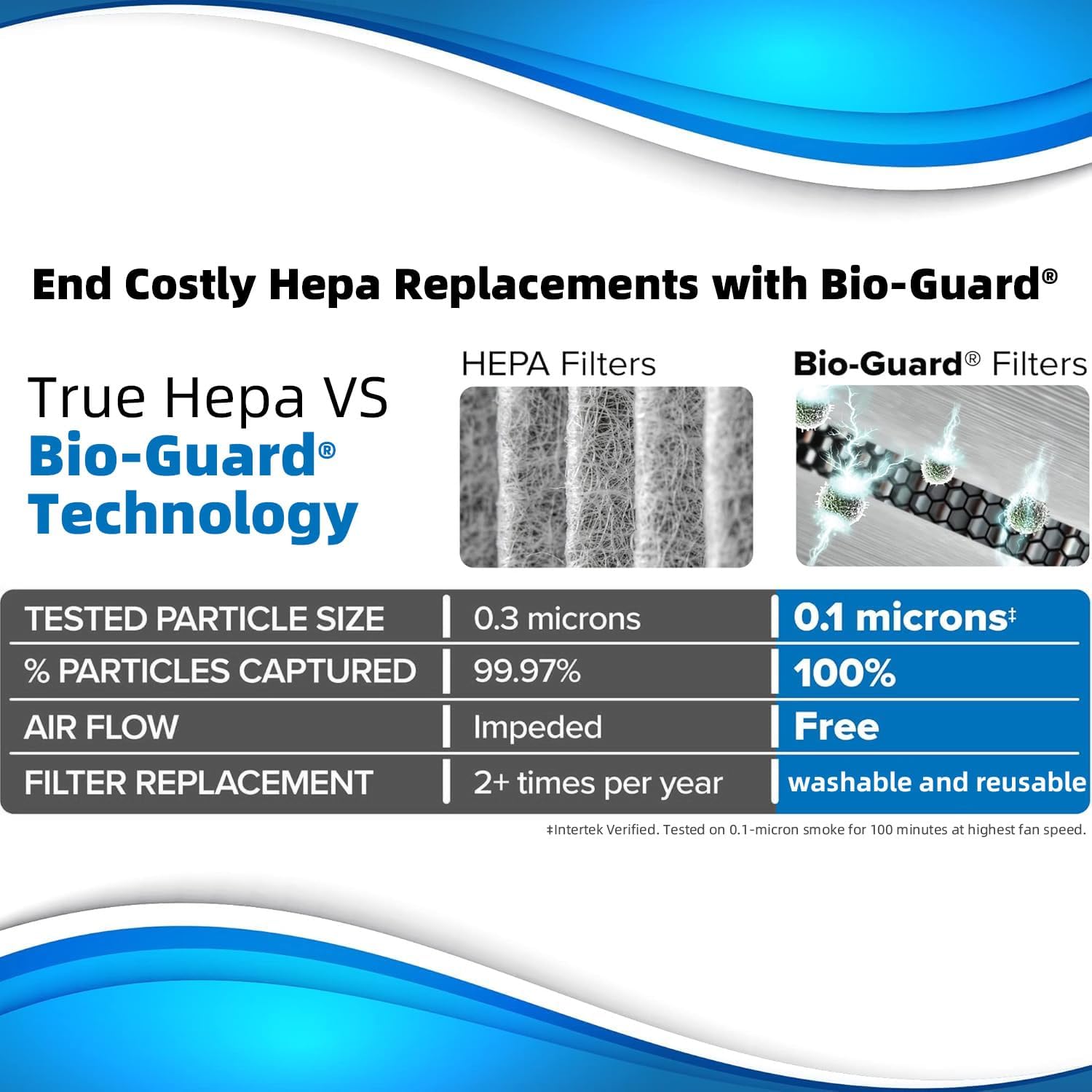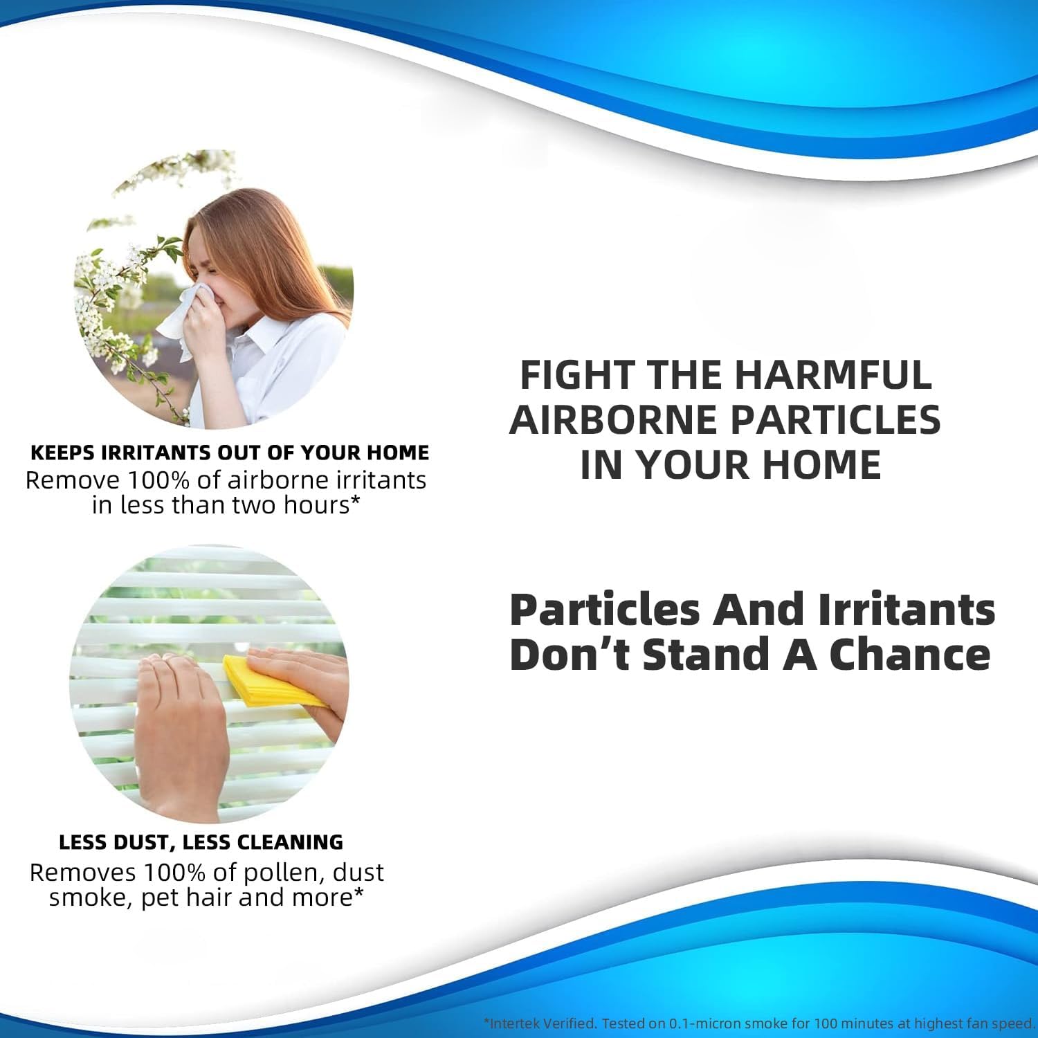 - INTERTEK LAB CERTIFIED – E500 captures 100% of airborne particle pollutants as small as 0.1 microns including smoke, dust, and pollen. It removes pollen, dust, pet hair, harmful chemicals, and Ozone.