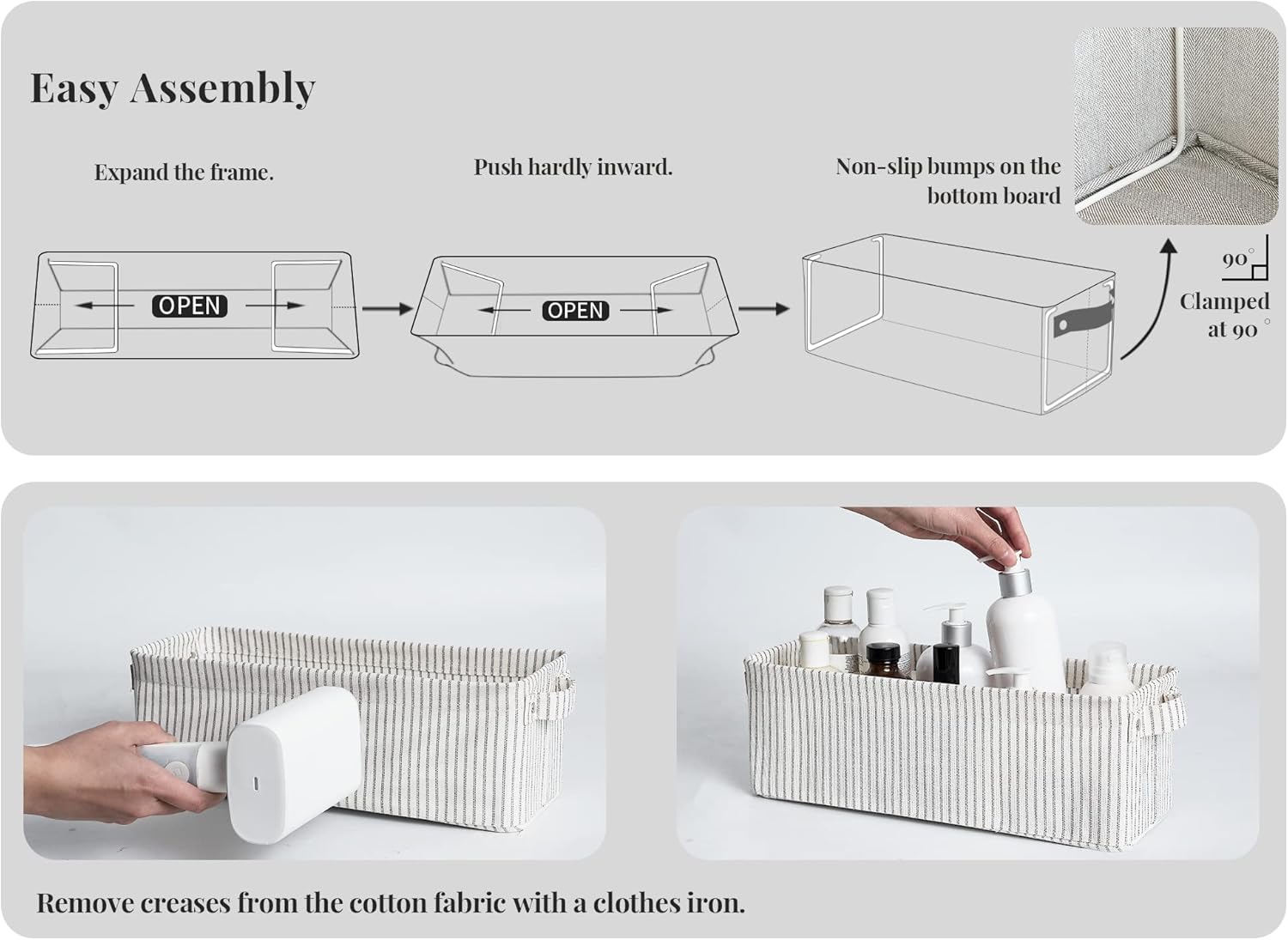 - The long storage basket features a sturdy metal support frame and non-slip bumps on the bottom board to keep it firmly upright.