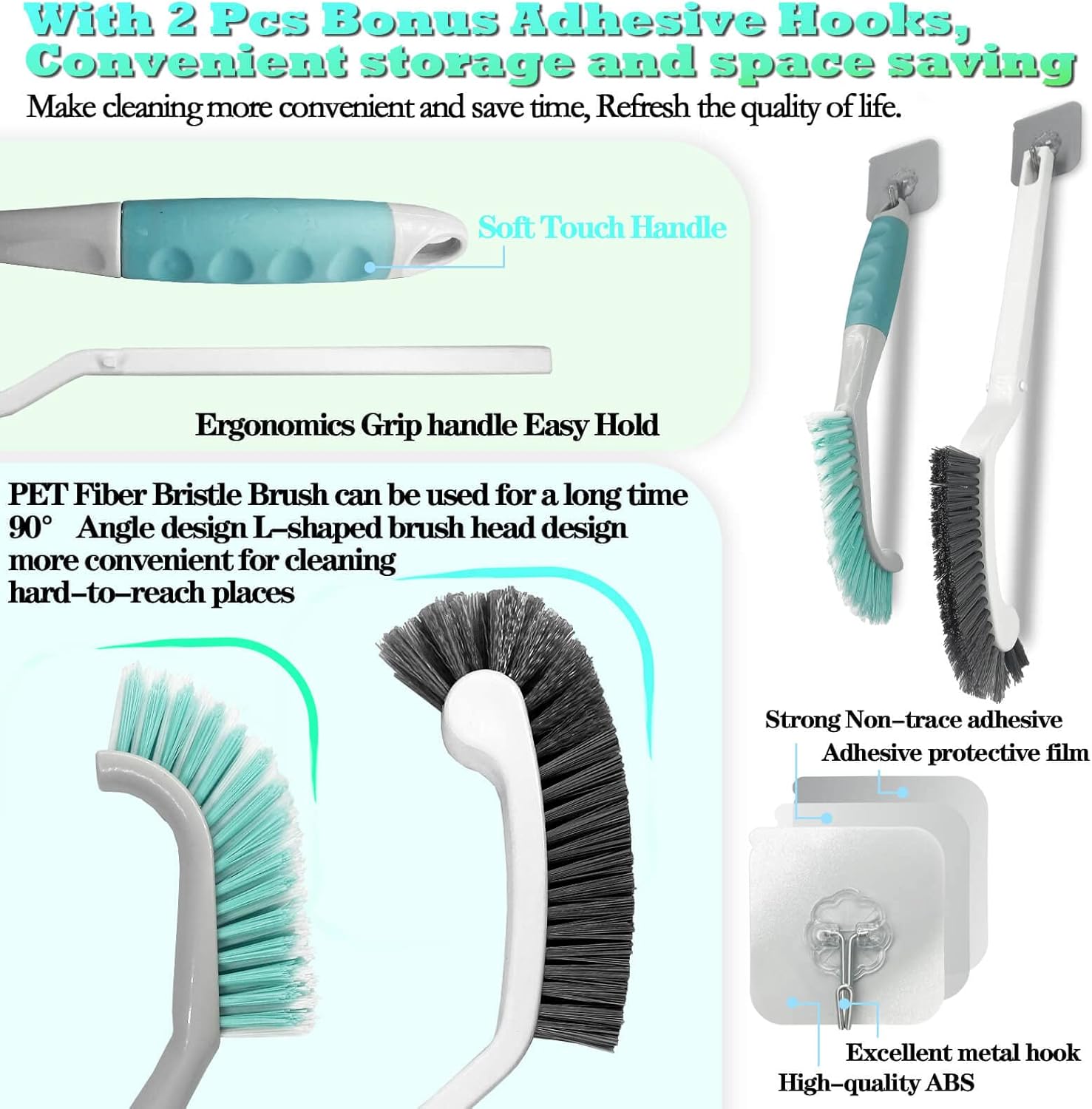 - 【User Friendly Design】Ergonomic Design-Comfortable handle. The Handles are made of High-quality plastic ABS and tough PP material, the brushes are made of premium PET fiber bristles, which are strong and durable without losing bristle. Easy to use, easy to store only hanging hold on adhesive hooks.
