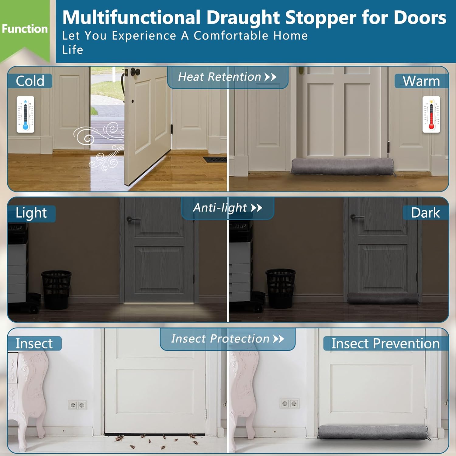 - MULTIFUNCTIONAL DAILY PROTECTION: Multifunctional door draft stopper can block cold wind, light, noise, smell, dust and to a greater extent. And Keep your space cozy. The most efficient solution is to prevent the heat and cold from escaping during winter and summer
