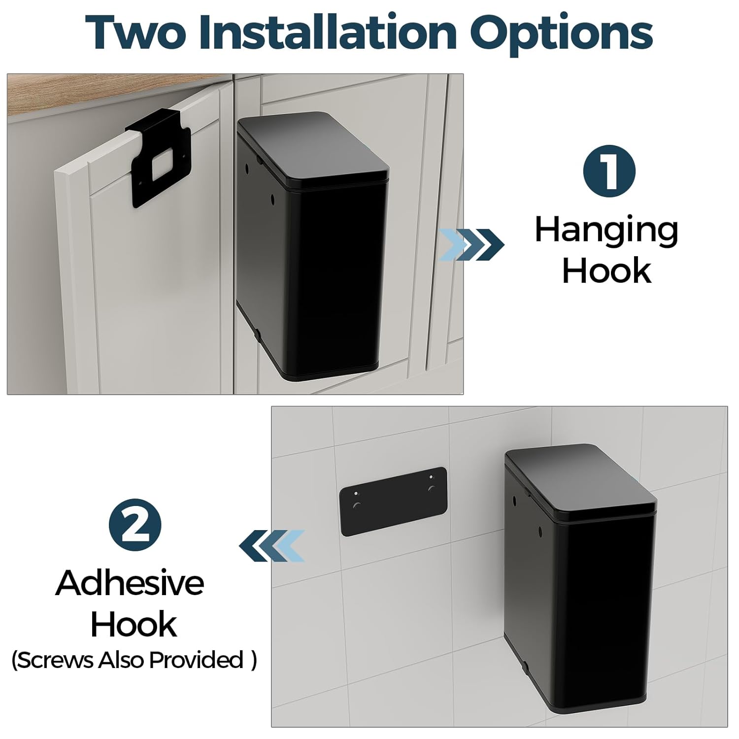 - Place Anywhere You Need - This trash can is designed to be used in three ways: hanging, sticking (wall mounted) and standing. It works great with reusable garbage bags, suitable for cabinet, kitchen, bathroom, bedroom, living room, office, toilet, apartments, RV, laundry, etc. Space saving and environmentally friendly bin can use conveniently wherever you need it.
