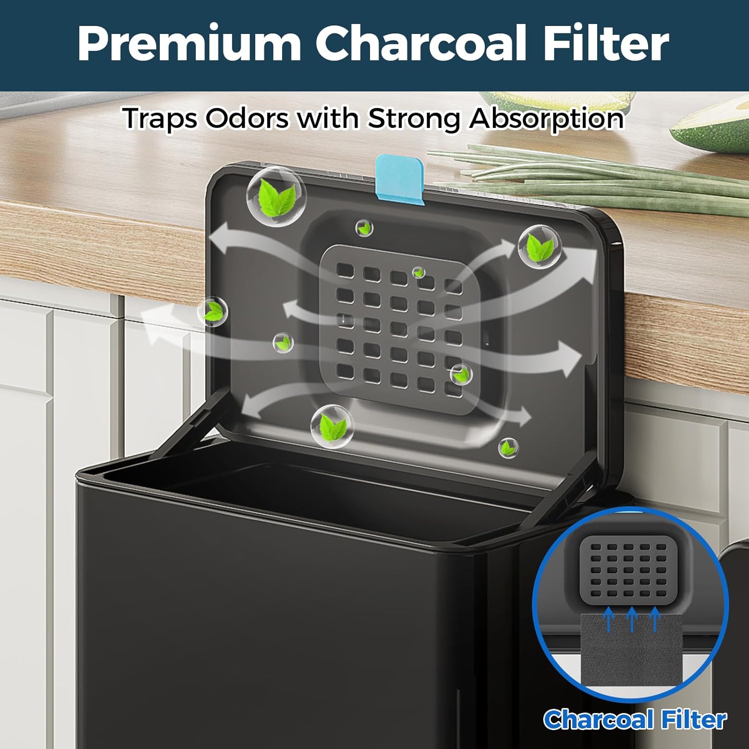 - Odor Absorbing Filter - The activated-charcoal filter included inside this trash can (NOT in other brands) traps and absorbs odors without leaking funky smells. Stainless steel trash can with lid enhances the sealing effect, specifically designed to hide smelling and fruit fly free.
