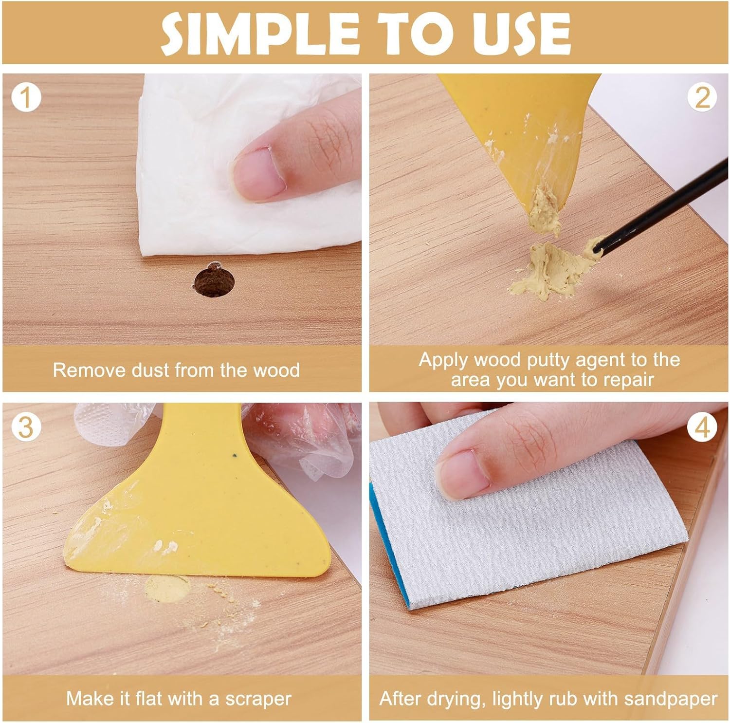 - Easy to Use:This natural wood putty is the most widely,easy-to-use,water-based wood filler in the world.Simply apply where needed,wait for more than 3 hours to allow the wood hole filler to dry naturally,and then sand with sandpaper.Please wear gloves when using.