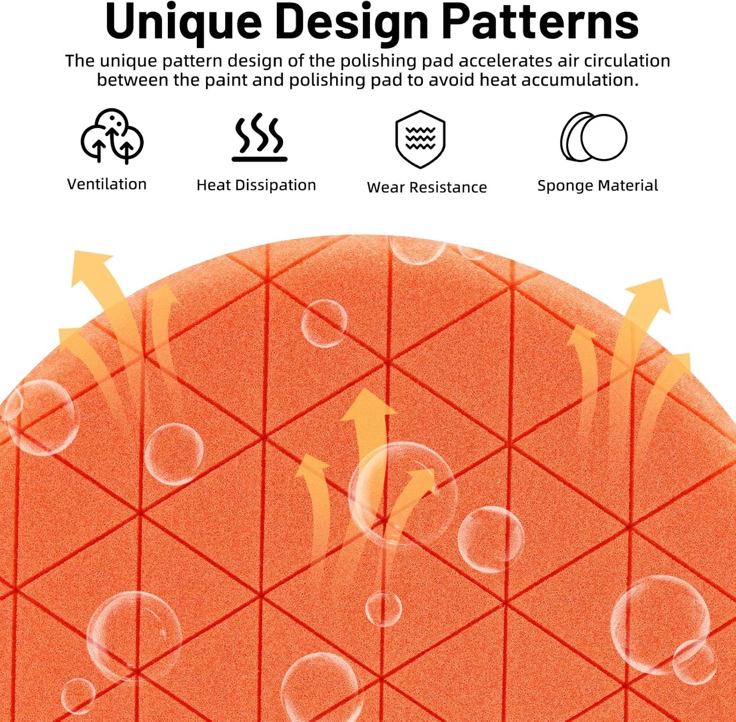 - 【Unique Design】The polishing pad has different sizes on both sides - 5.5"/140mm on the front and 5"/125mm on the back. The unique honeycomb pattern design on the surface can protect the surface from scratches during polishing, reduce the wear of the polishing pad itself, improve the airflow between the pad and the surface, and also have the function of heat dissipation