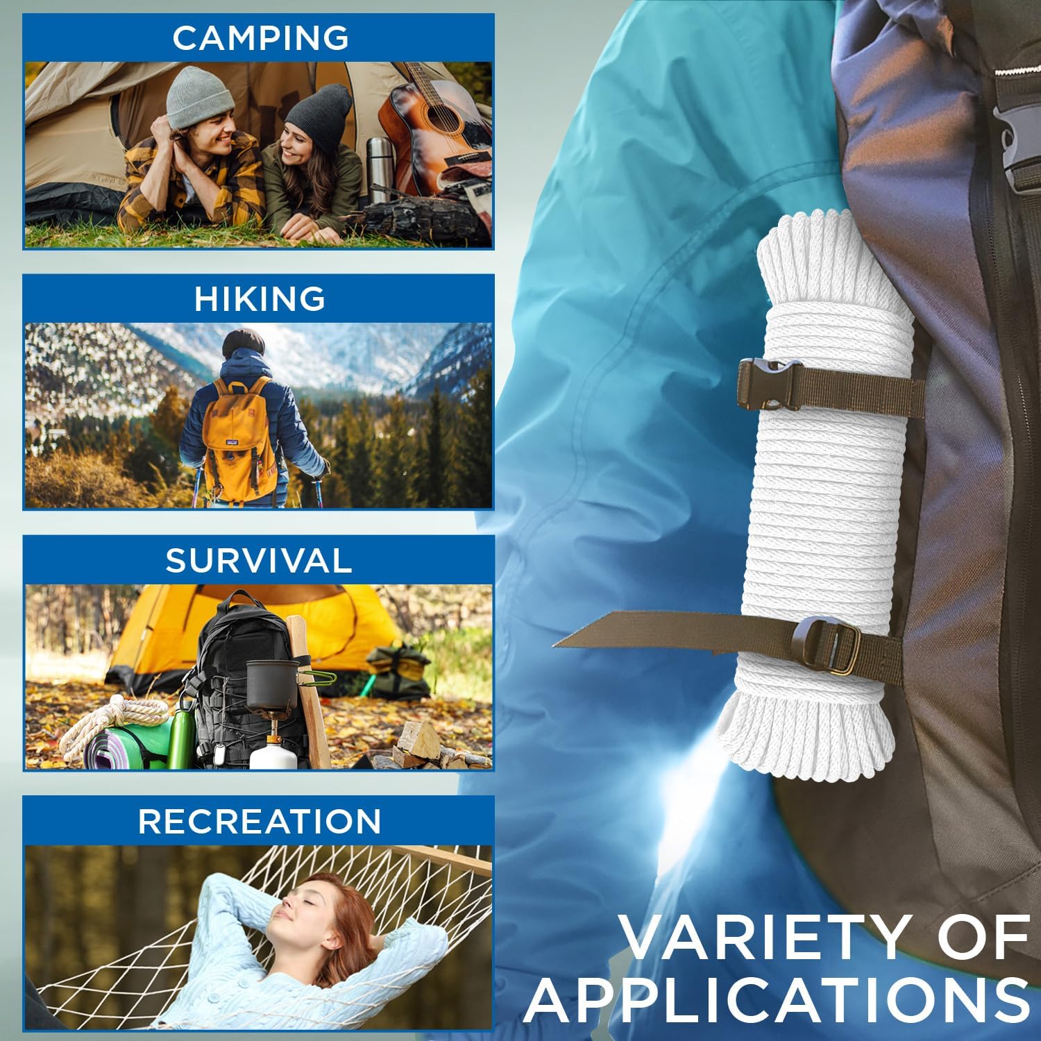 - MUST-HAVE: General Application Rope is widely used for tying down equipment, weaving hammocks, as window sash cord, clothes line cord, moving rope, laundry line, flagline rope, etc. The thin cotton rope is essential for every home. Always have it on hand in your car, garage, garden or home.