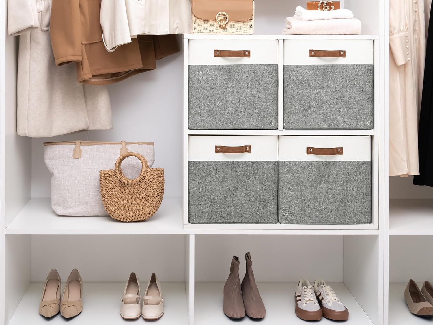 StorageWorks 13x13 Inches Storage Cube, Fabric Storage Bins with PU Handles, Collapsible Organizer Baskets for Closet, Gray and White, 4-Pack