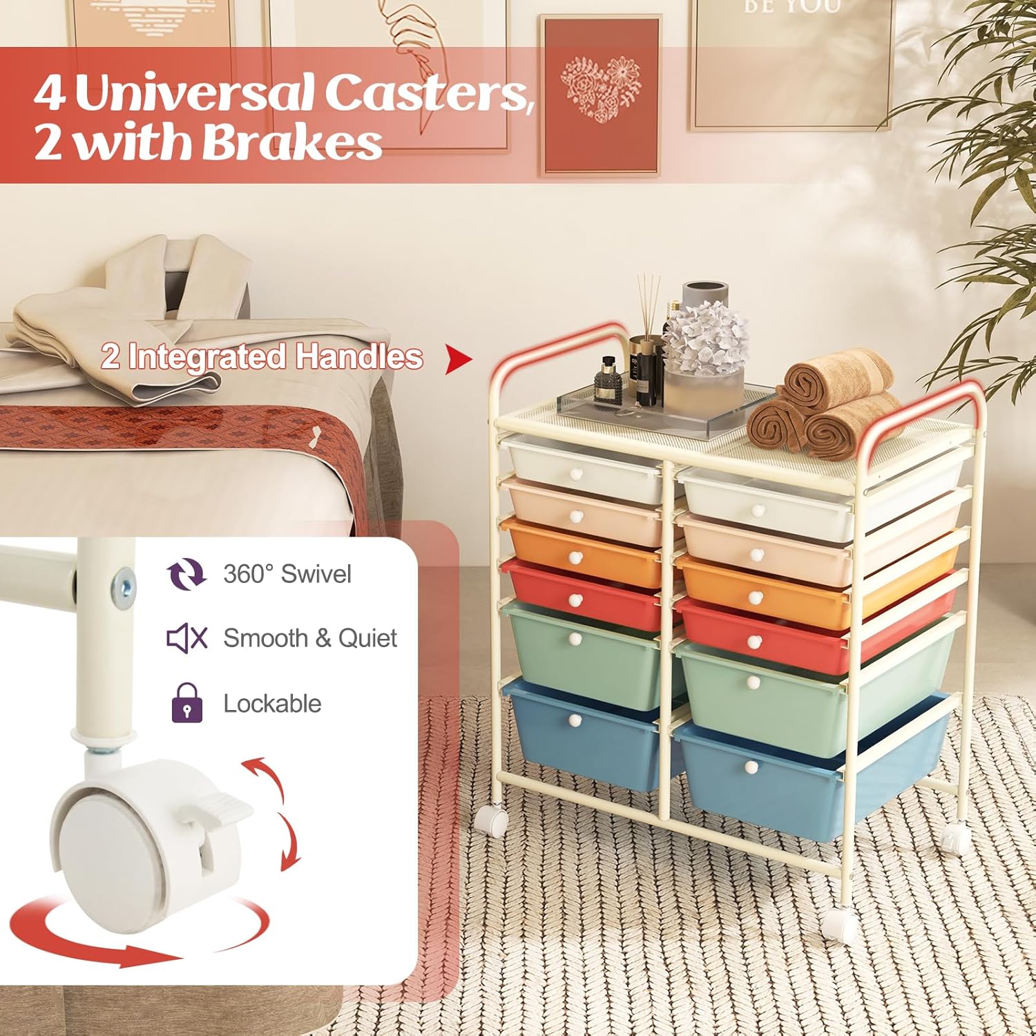 GOFLAME 12-Drawer Rolling Storage Cart, Multipurpose Organizer with 2 Sizes Plastic Drawers, Mobile Utility Cart with Lockable Casters for Home, Office, Beauty Salon, School, Macaron Color