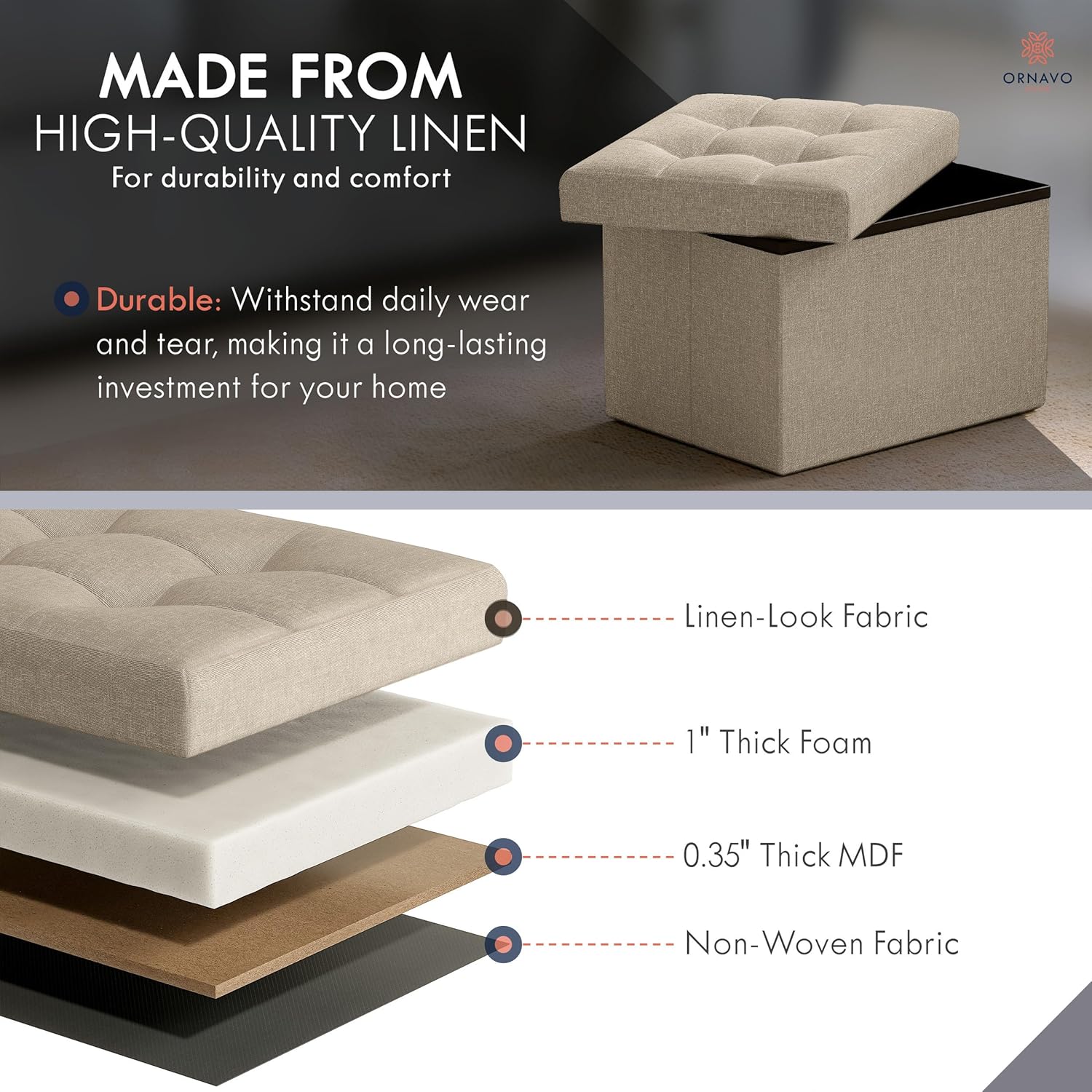 - MULTI-USE OTTOMAN - This versatile piece is not only functional, but also stylish and space-saving. Crafted from high-quality linen, this ottoman is both durable and comfortable, making it the perfect addition to your living room, bedroom, or any other space in need of additional seating or storage.