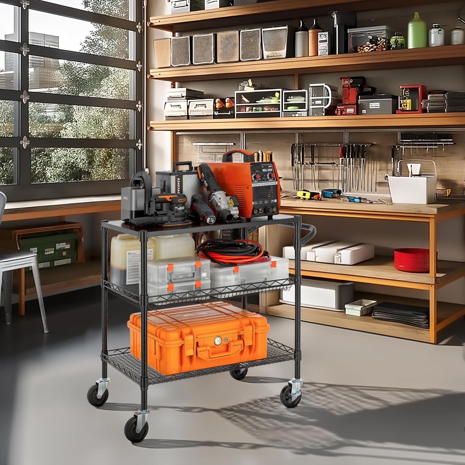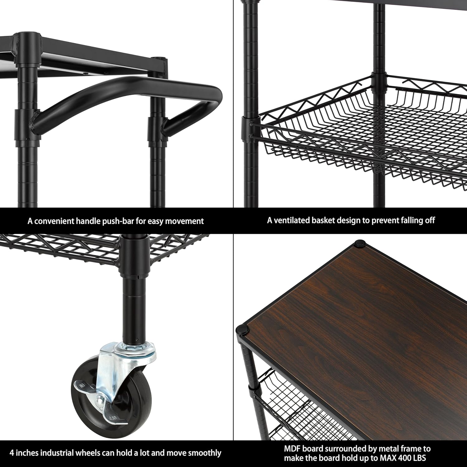 Finnhomy 3 Tier Heavy Duty Commercial Grade Utility Cart with Wood Top, Wire Rolling Cart with Wheels and Handle Bar, Kitchen Carts on Wheels, Metal Cart with 600 LBS Capacity, Black