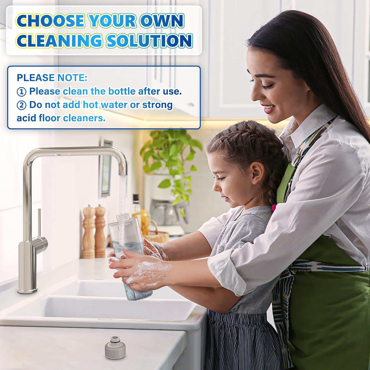 - 【MEXERRIS Tips】:③Please don't fill boiling or impurity water, strong acid,alkali detergent into the bottle of the wet mop.④Please fully dilute solutions with plain water,because concentrated solutions may corrode mop internal parts or some floor types. ⑤ There are two small silicone plugs on the bottle cap of our spray mop. Please be careful not to lose them when cleaning the bottle to prevent the bottle from leaking.