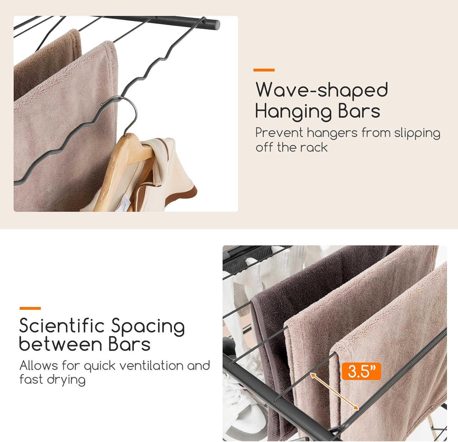 - [Enhanced User-friendly Design]: The wave-shaped hanging bars prevent hangers from slipping off the rack, while scientifically spaced bars ensure quick ventilation and fast drying. The gentle air-drying process helps to maintain the quality of your clothes and extend their lifespan.