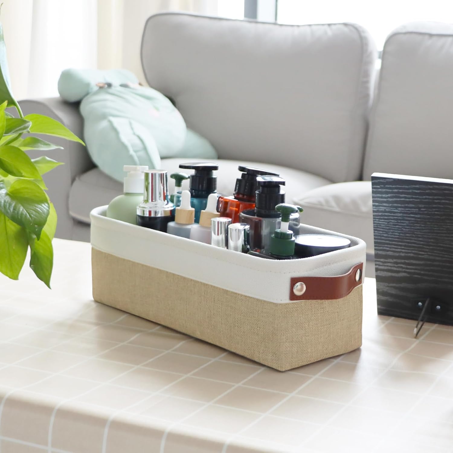 Univivi 4PC Long Narrow Storage Baskets, Small Fabric Storage Bins with PU Handles for Closet,Cabinet,Countertop Organizing Small Items(Khaki-15x6x5 inch)
