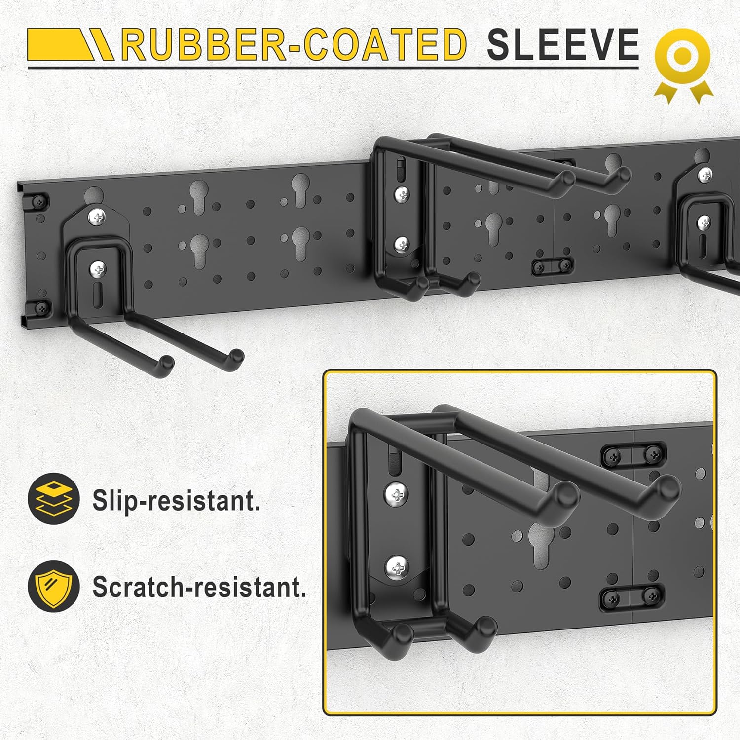 - Premium Material—Crafted from solid powder-coated steel for strong organization, holds up to 440LBS. All the hooks wrapped in rubber to protect your tools from sliding and getting damaged.