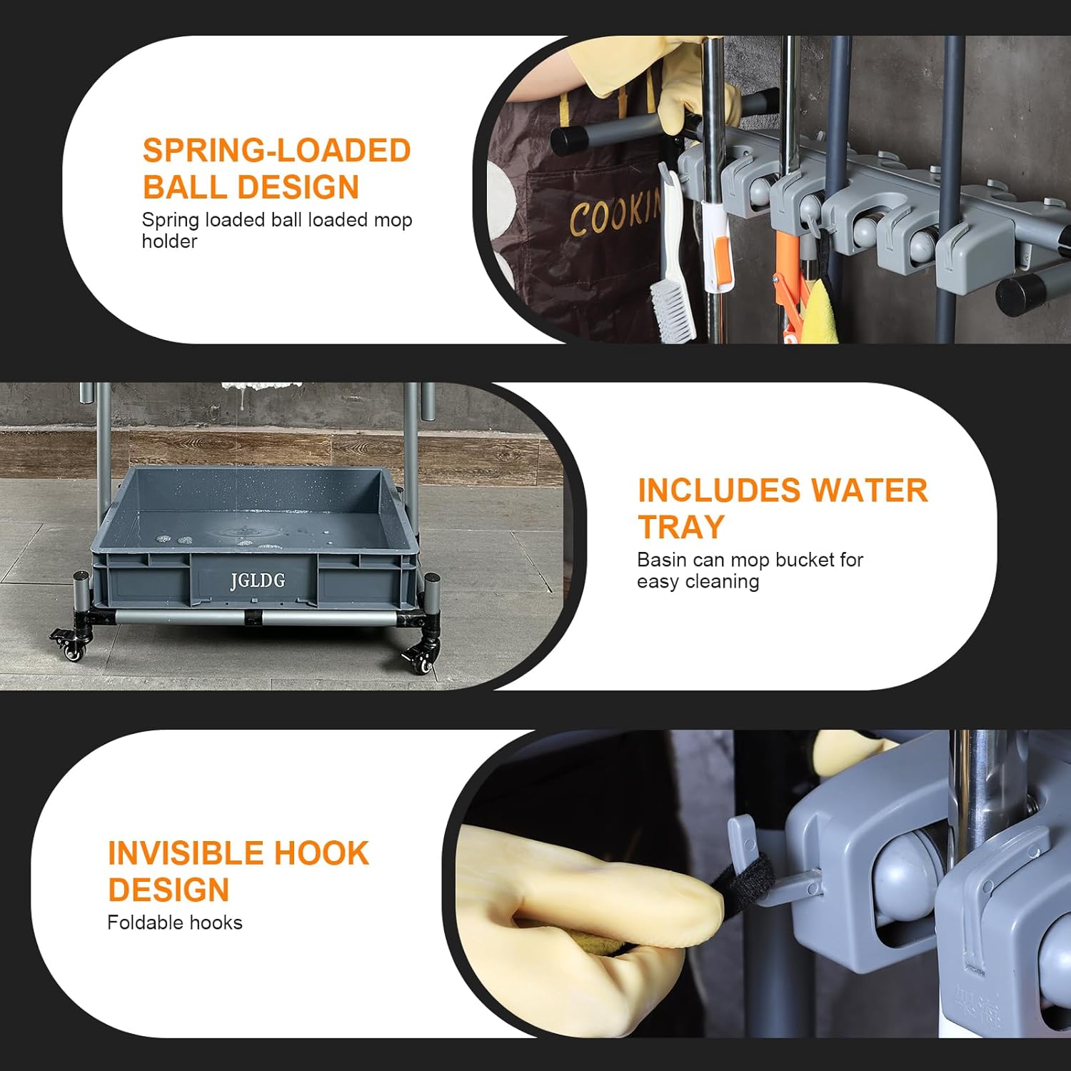 - 3. 【Water Collection Tank】: The bottom of the rack features a water tank designed to collect moisture from wet tools such as mops and cloths. This prevents water from dripping onto the floor, keeping your space clean and dry.
