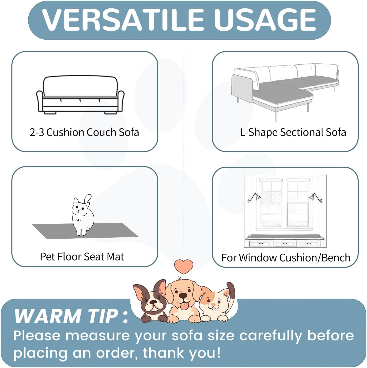 - Protects Furniture -- Washable sofa covers provide a cozy and comfortable spot for your pet to rest, serves as a barrier between your pet and your furniture, protecting your sofa chair or floor from scratches, dirt, and pet hair. NOTE: Please Measure The Size of Your sofa carefully before purchasing to get a perfect fit, THANK YOU!