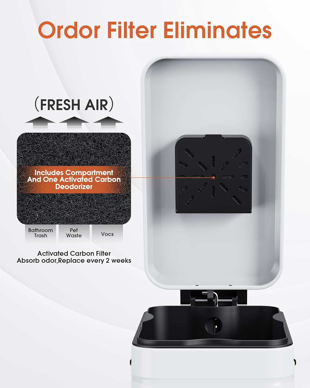 - Odor-Free: The Odor Control trash can included compartment and activated carbon deodorizer absorbs waste odors, 360° sealed space prevents odors from escaping from the can, making your space cleaner