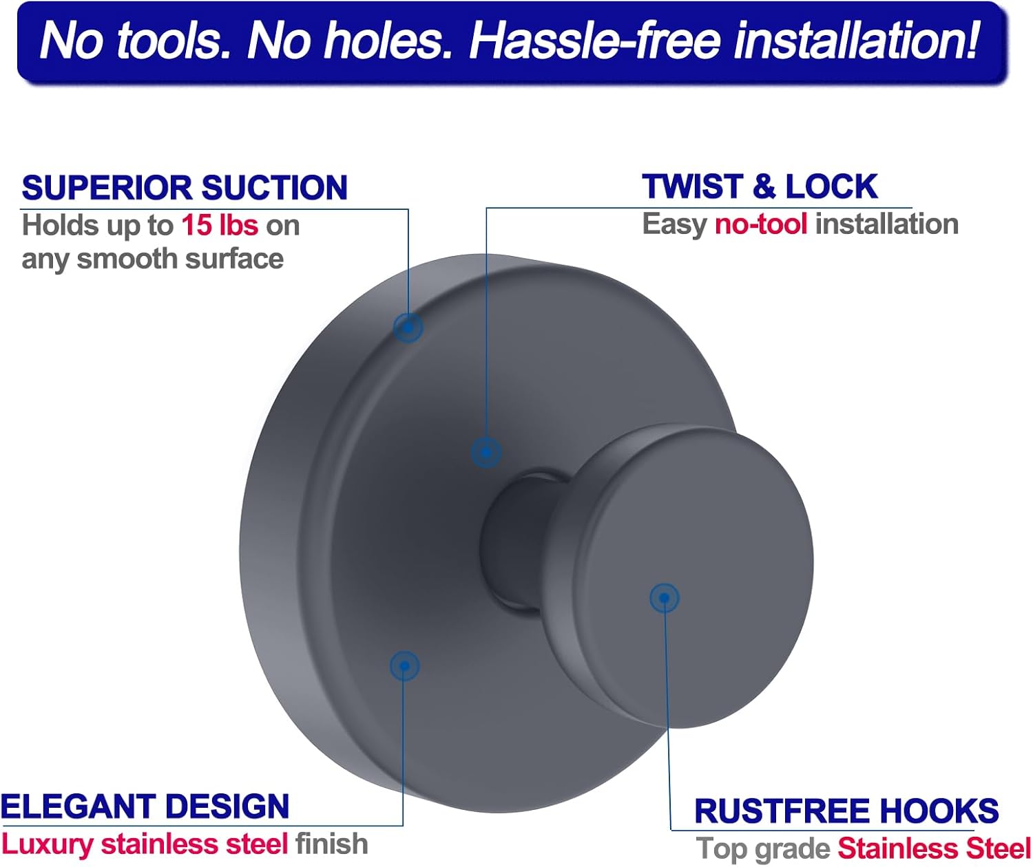 - [Functionality Meets Style]: With a super sticky silicone base and advanced vacuum suction technology, these hooks deliver strong, reliable support. Simply turn the knob clockwise to eliminate air and maximize suction power. Each hook can hold up to 15 lbs