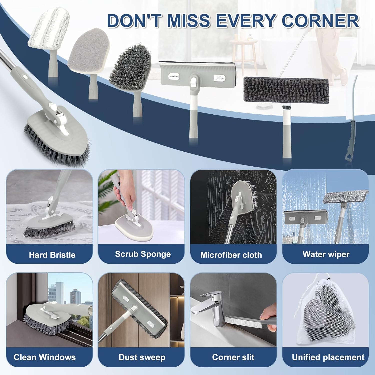 - 5-in-1 Cleaner Brush -- This floor scrubber set has different high-quality cleaning heads, including 1* hard brush, 1* scrubbing sponge, 1* microfiber pad, 1* dust cloth, and 1* 2-in-1 glass scraper. It's suitable for cleaning floors, bathrooms, bathtubs, walls, glass, etc., meeting most cleaning needs at home.
