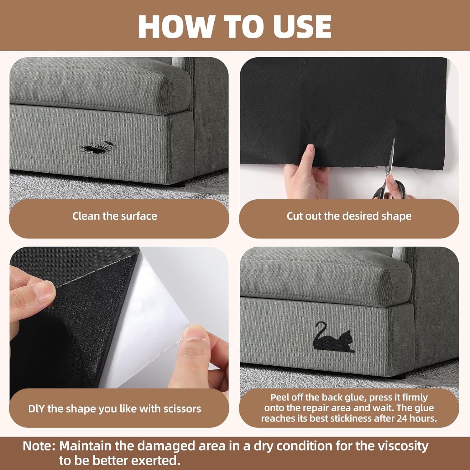 - Quick Fix: Our Fabric Repair Adhesive is easy to use. Simply clean the area to be repaired, peel off the adhesive backing, and stick it to the area. It will stick well in just a few seconds.