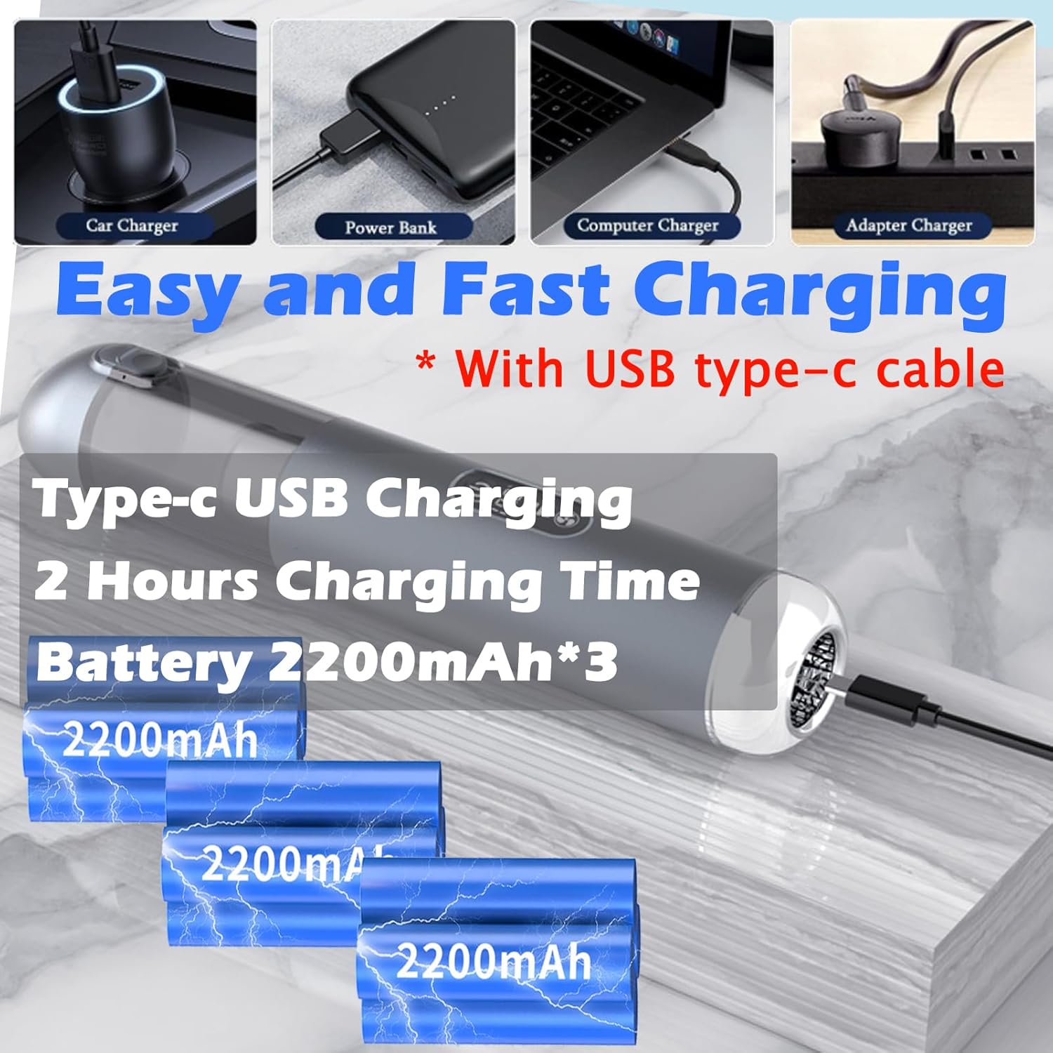 - Fast Charge & Long Lasting Time: The cordless vacuum handheld takes only 2.5 hours to fast charge the mini vacuum cleaner. 2200mAh*3 batteries and fast charging technology. It offers the USB-C universal charging port takes the hassle out of finding a dedicated charging cable