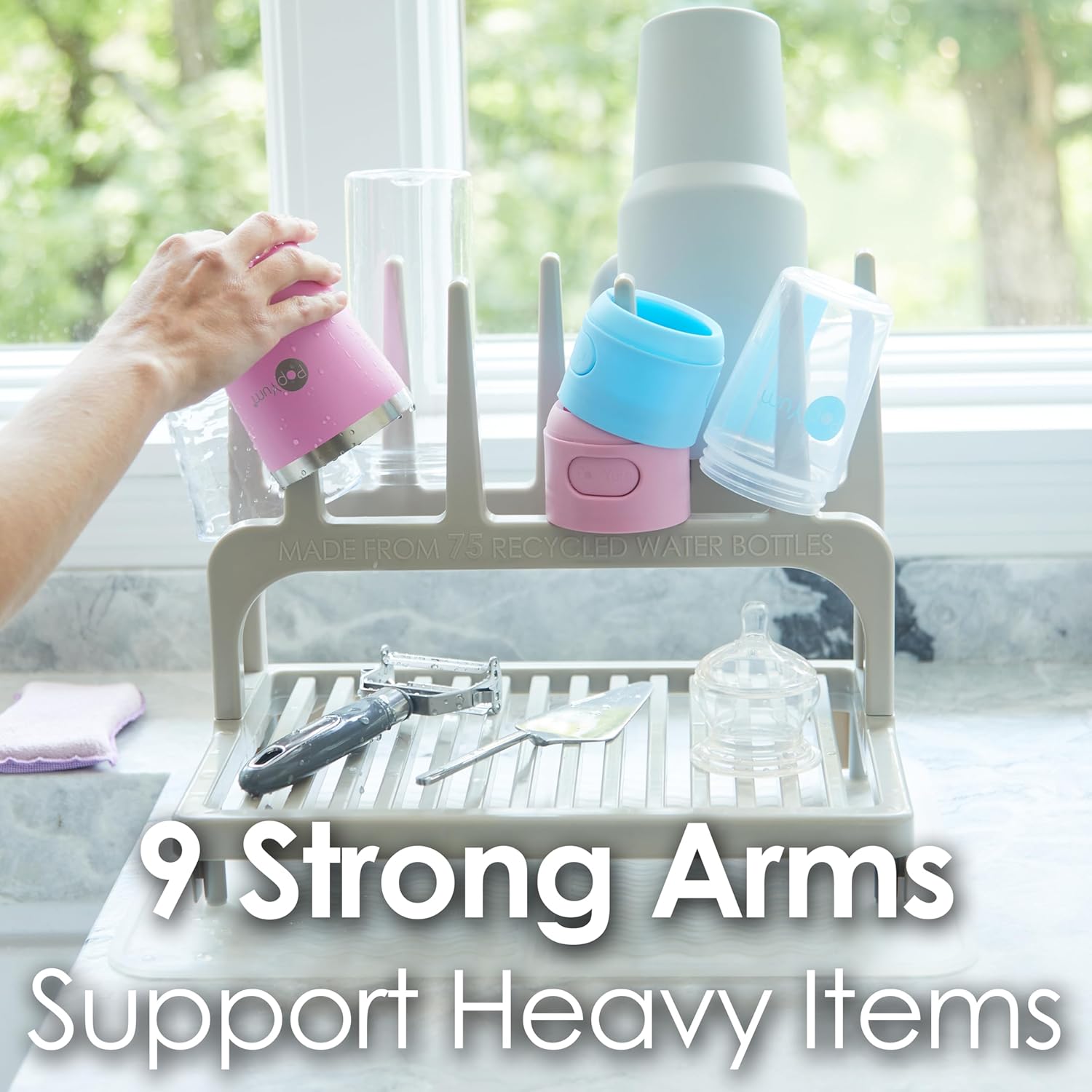 - ✅ MADE FROM 100% RECYCLED WATER BOTTLES! PopYum’s drying rack upcycles 75 water bottles (500ml/16oz size) and keeps them out of our oceans, landfills and environment. Includes a Seattle gray space saving drying rack and a clear frosted silicone drying mat (12x16 in, 30x40 cm).