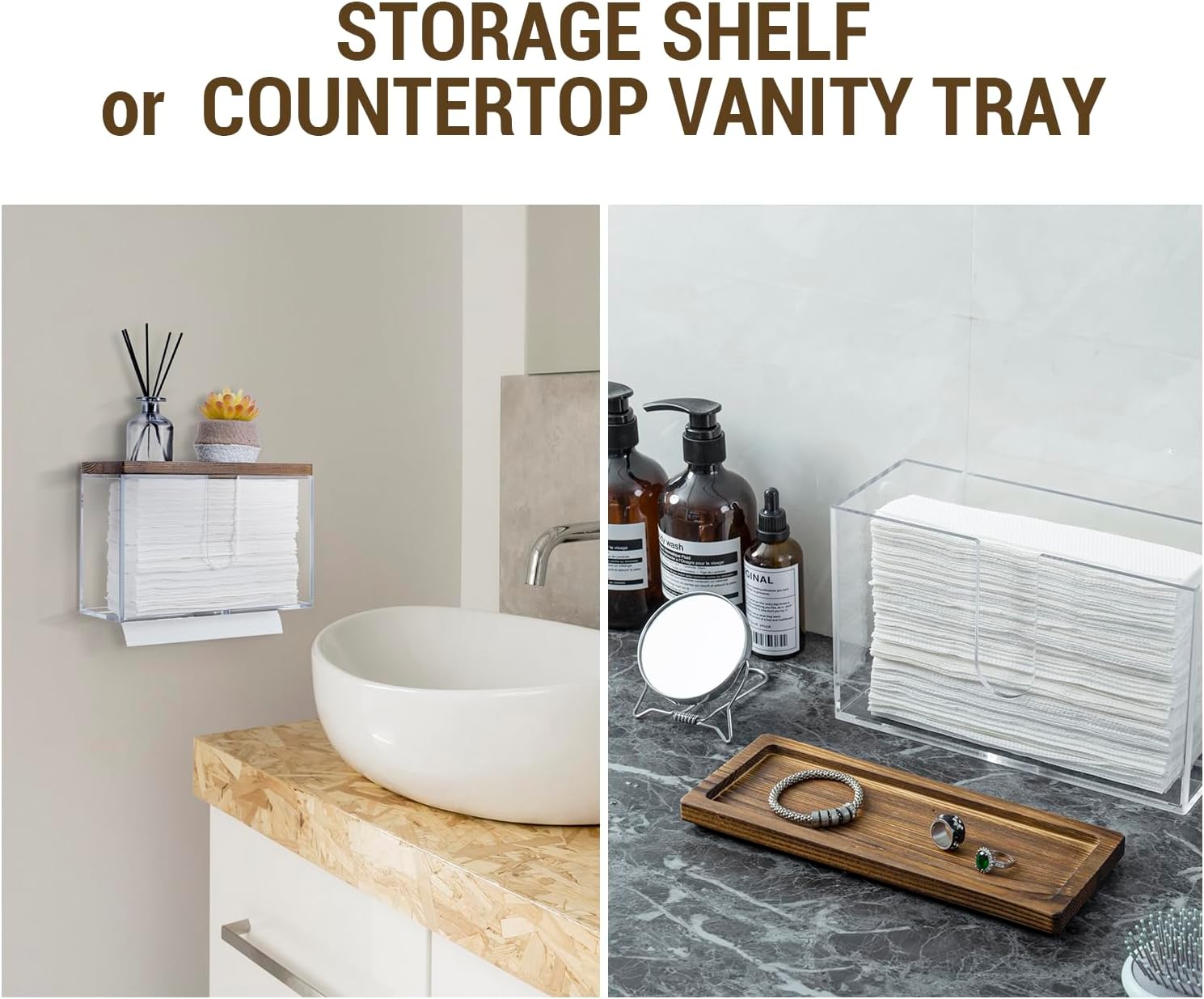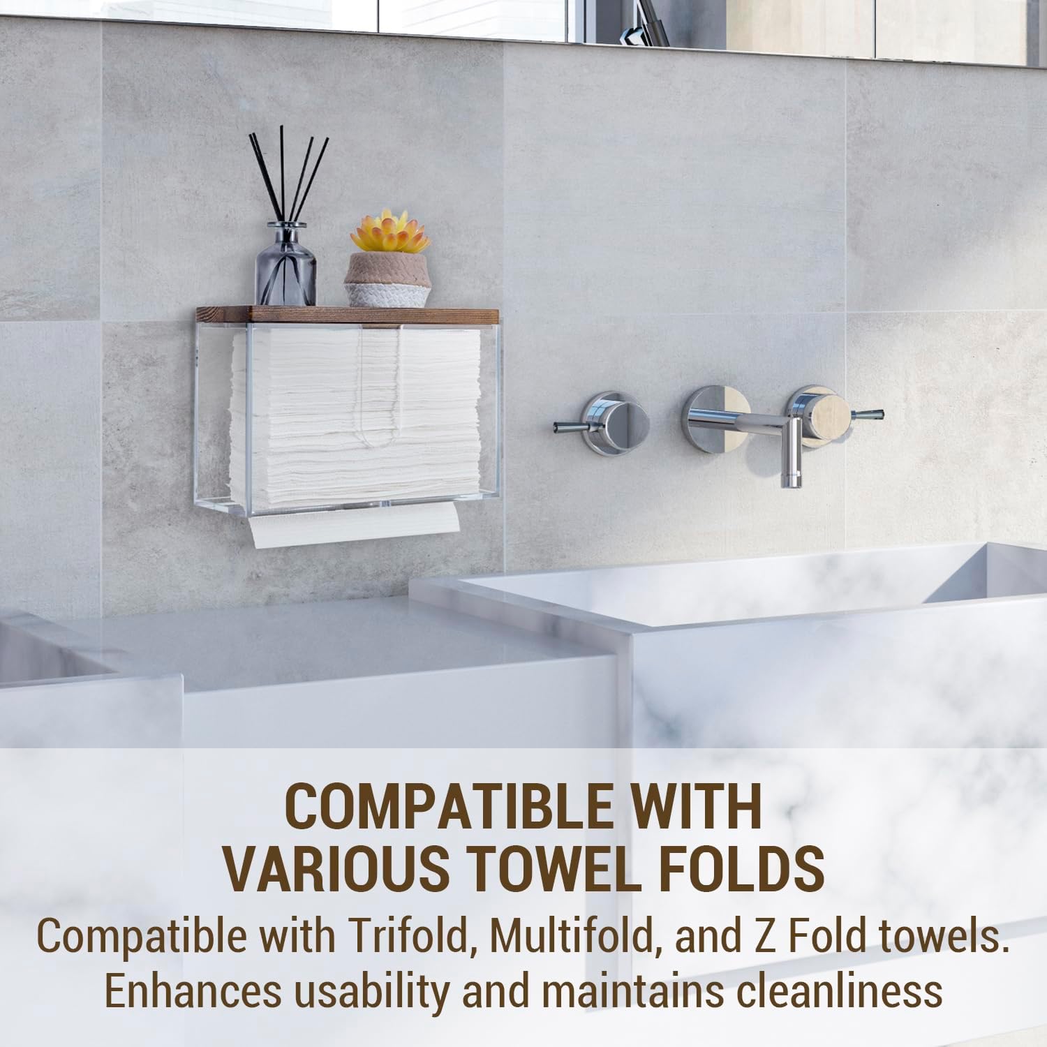 - Wall mounted folded paper towel holder and wooden display tray for commercial guest use in a bathroom, kitchen, office break room, and more